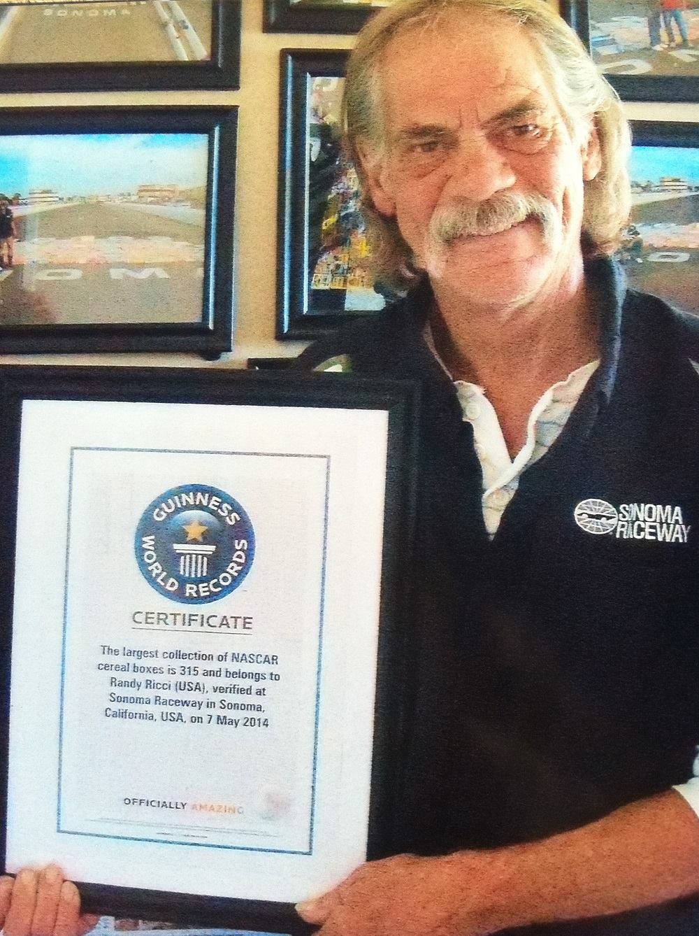 The boxes are kept in pristine condition, never opened. Most are stored in bins at the Sonoma Raceway, and in four more bins at his home. When Ricci asked Guinness if he had set the record for the most NASCAR cereal boxes, he learned they didn’t have such a category. So they set requirements for him to meet, including videotaping and photographing his entire collection, along with two witnesses on hand to verify there were no duplicates. He assembled a nine-person team to set the collection out on the Sonoma Raceway track in spring 2014. By the end of the year, Ricci got word that he had achieved a new Guinness World Records title, and an official certificate followed in the mail.