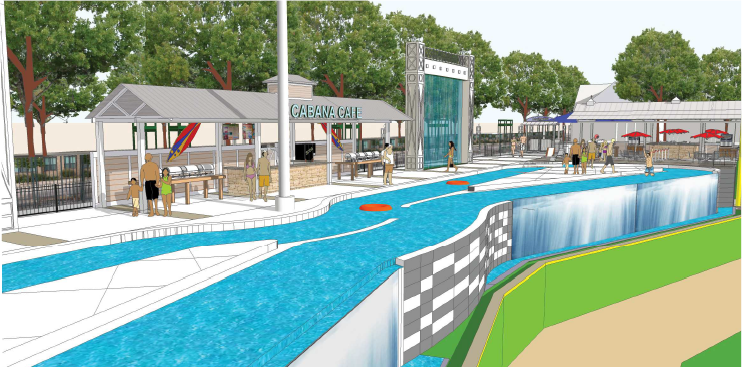 Construction on the $1.5 million, 3,000-square-foot lazy river began in February. Shaped like a flattened figure eight and featuring 113 linear feet of waterfalls fronting the ball field, twin water curtains standing at attention at the back of the enclosed area will feature 18-foot-tall cascading sheets of water lit with color.
