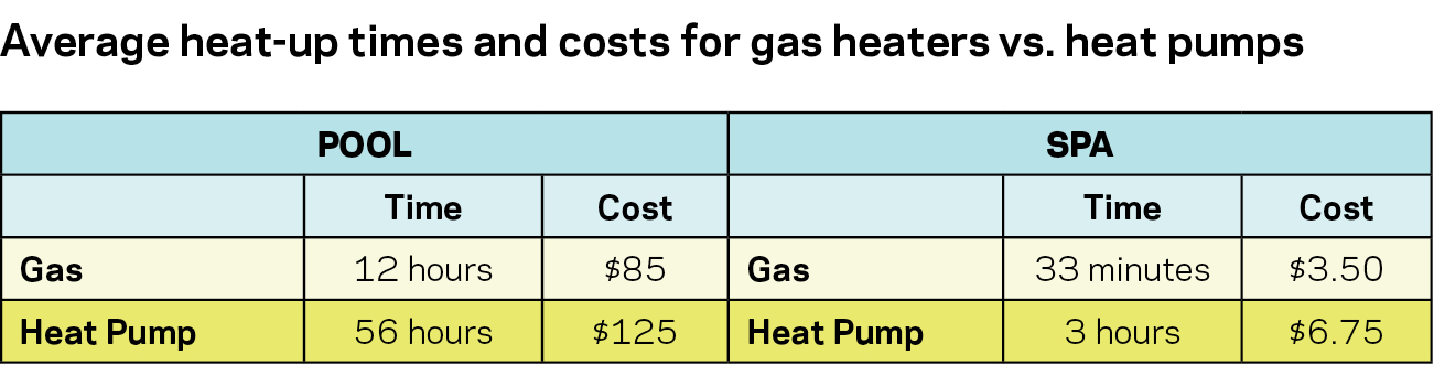 The main disadvantage is the length of time required for heat pumps to heat a pool or spa. It will take four to six times as long to heat the water than with a gas heater. This notable difference in heat-up time will likely come as a big shock, especially for consumers who have owned gas-heated spas in the past with a typical heat-up time of 20 minutes, compared to three or more hours with a heat pump.