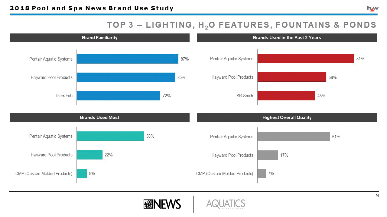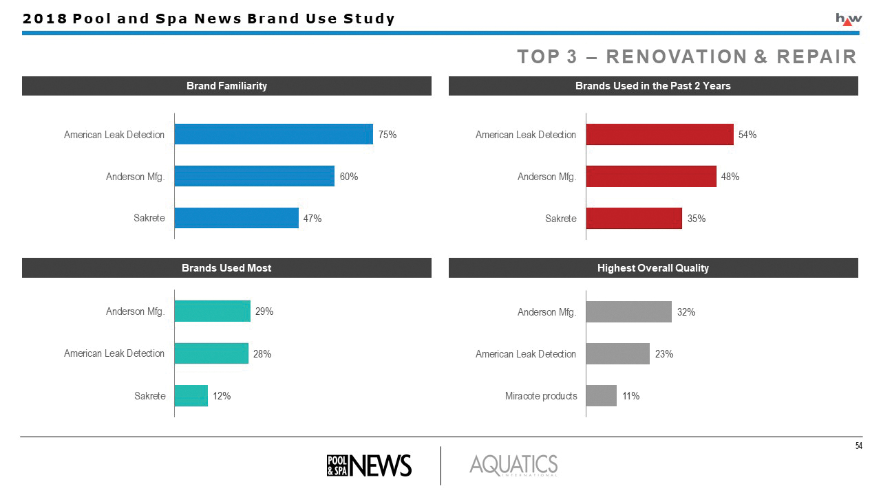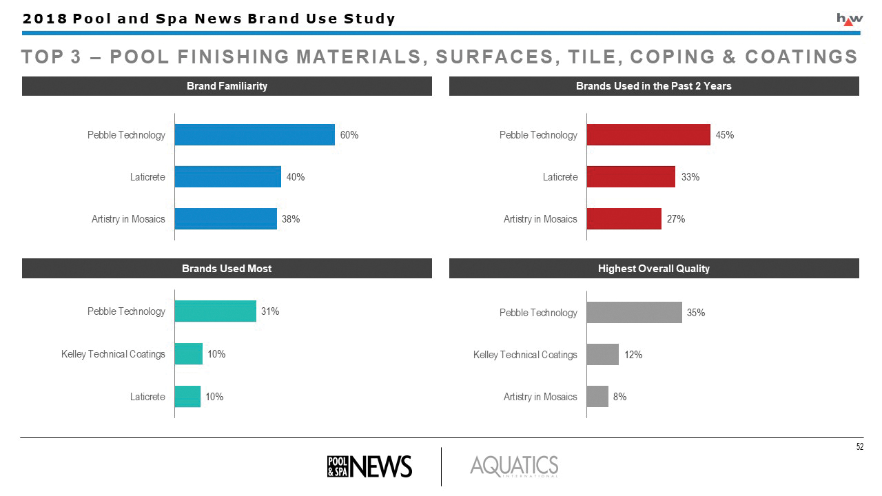 That’s what PSN wanted to find out when we surveyed 887 pool/spa builders, retailers and service professionals. The study, conducted by Farnsworth, covered 20 product categories, with respondents indicating which brands they are familiar with, which they’ve used in the past two years, which one they use the most and which one they believe offers the highest quality.