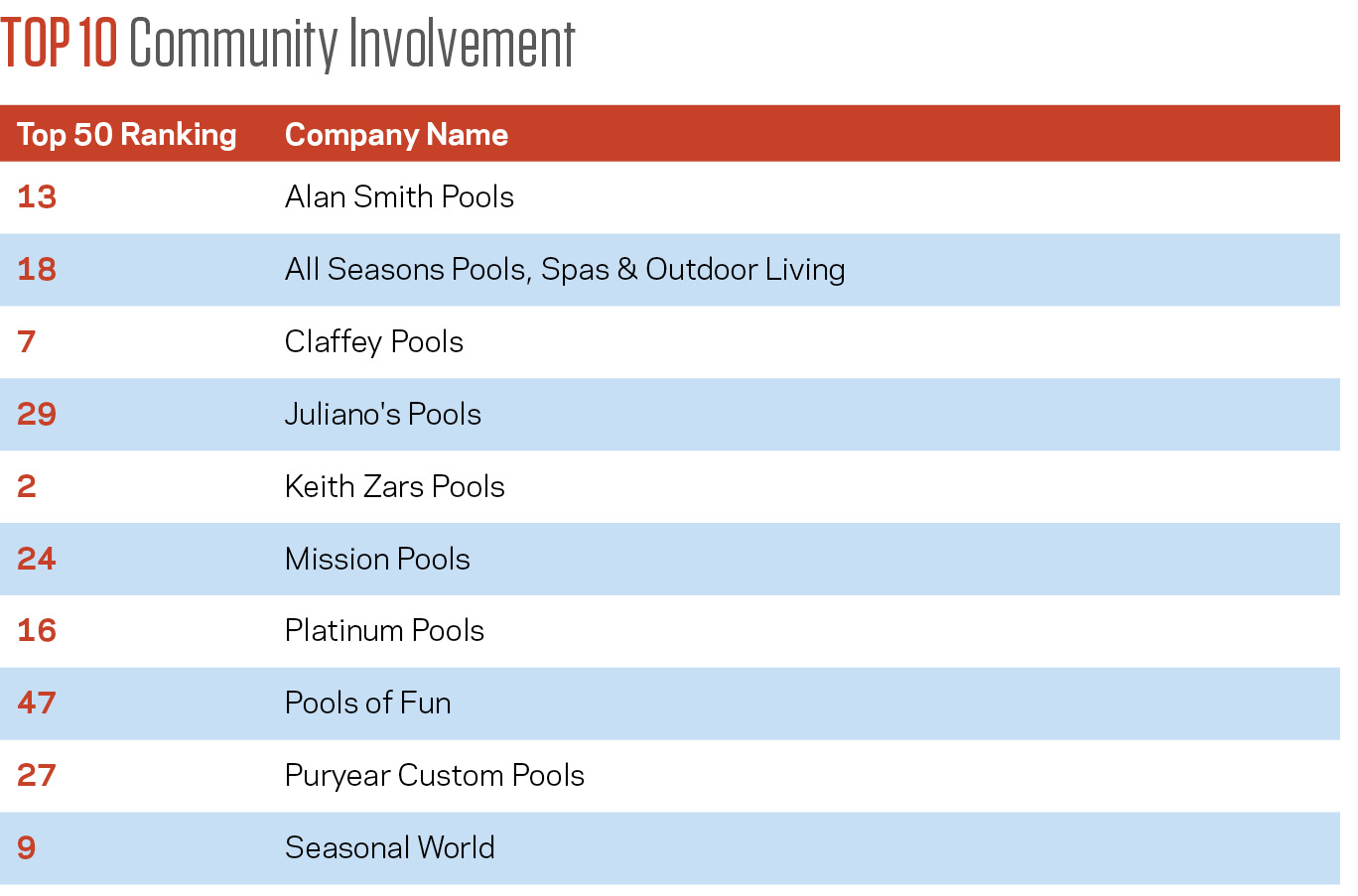 Not only does a commitment to community show good citizenship, but it can add depth and breadth to a company’s marketing and outreach. These 10 companies, listed alphabetically, received the highest scores for community involvement. They channel the same proactivity to their causes as they do to business: This group tended to donate and build whole pools, organize elaborate fundraisers and sponsor their own staff’s volunteer outings.