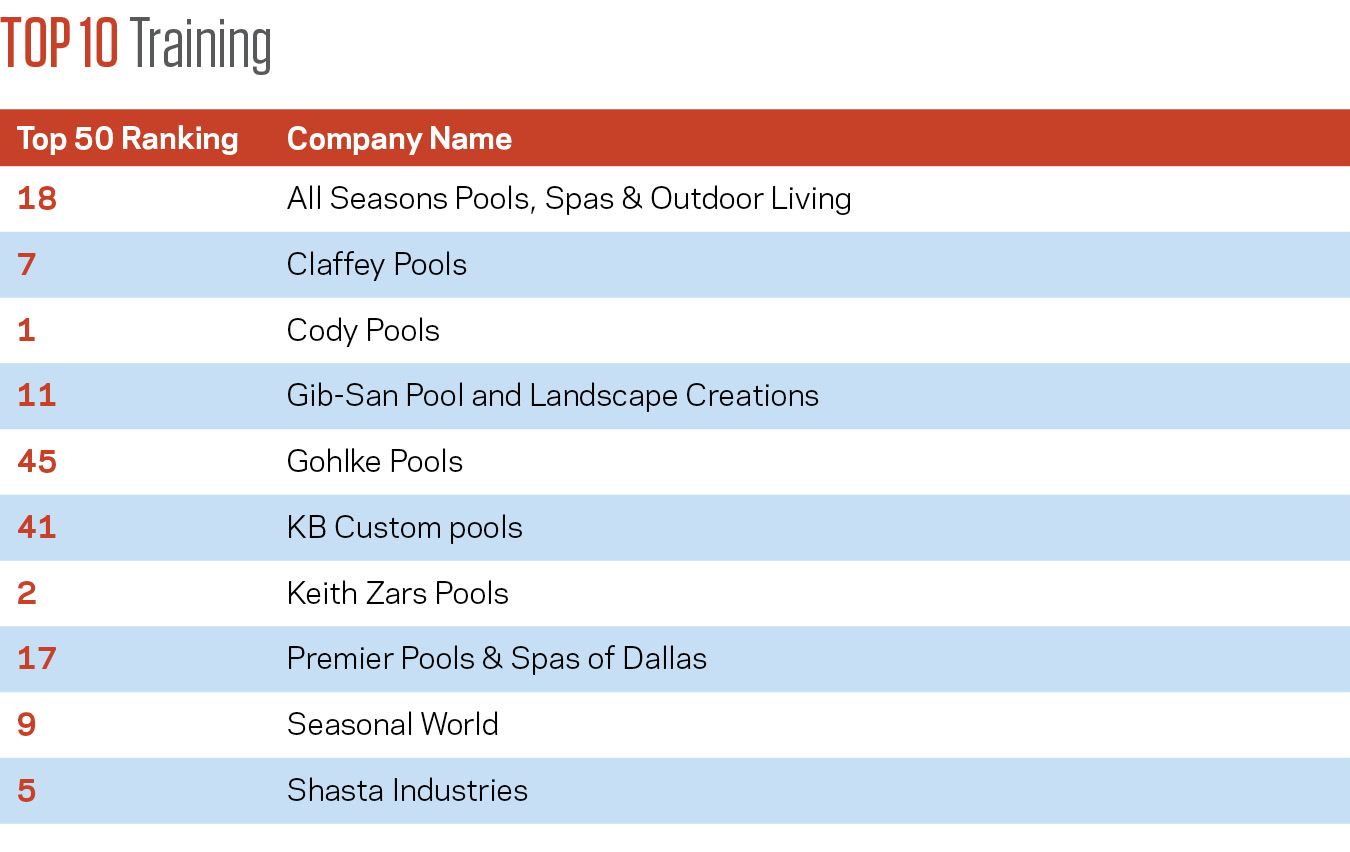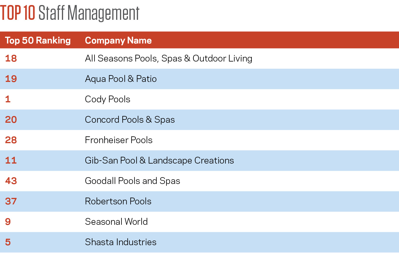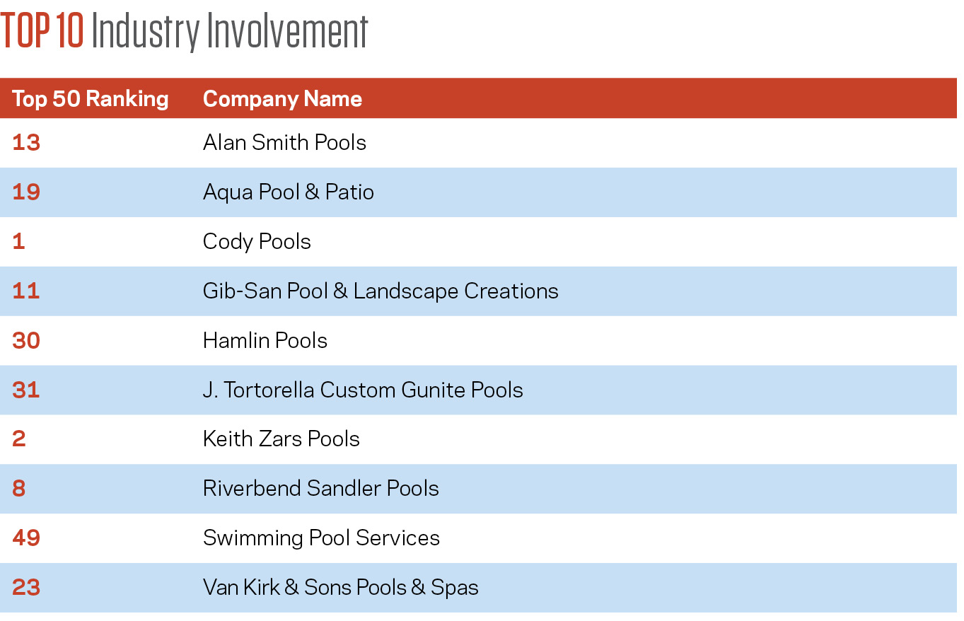 A cohesive industry is a strong one. And companies that network with others, both inside and outside the industry, benefit from the connections in innumerable ways. For this category, applicants reported their involvement in professional associations and organizations within the pool/spa industry, as well as in peripheral fields. These 10 builders, listed alphabetically, showed the most commitment in this regard.
