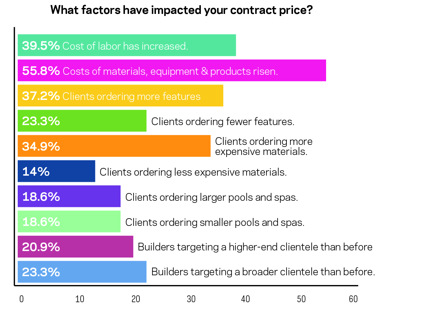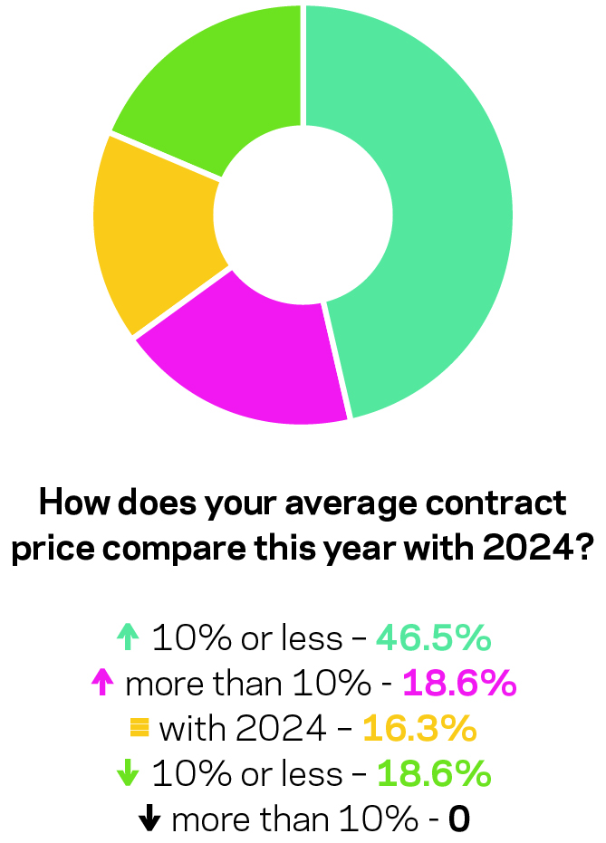 Nearly two-thirds of the Top 50 — 65.1% — have seen an increase in average contract price since even last year. Of these, 20.9% of respondents said the price has risen 5% or less, while 25.6% have seen hikes of 6% to 10%.