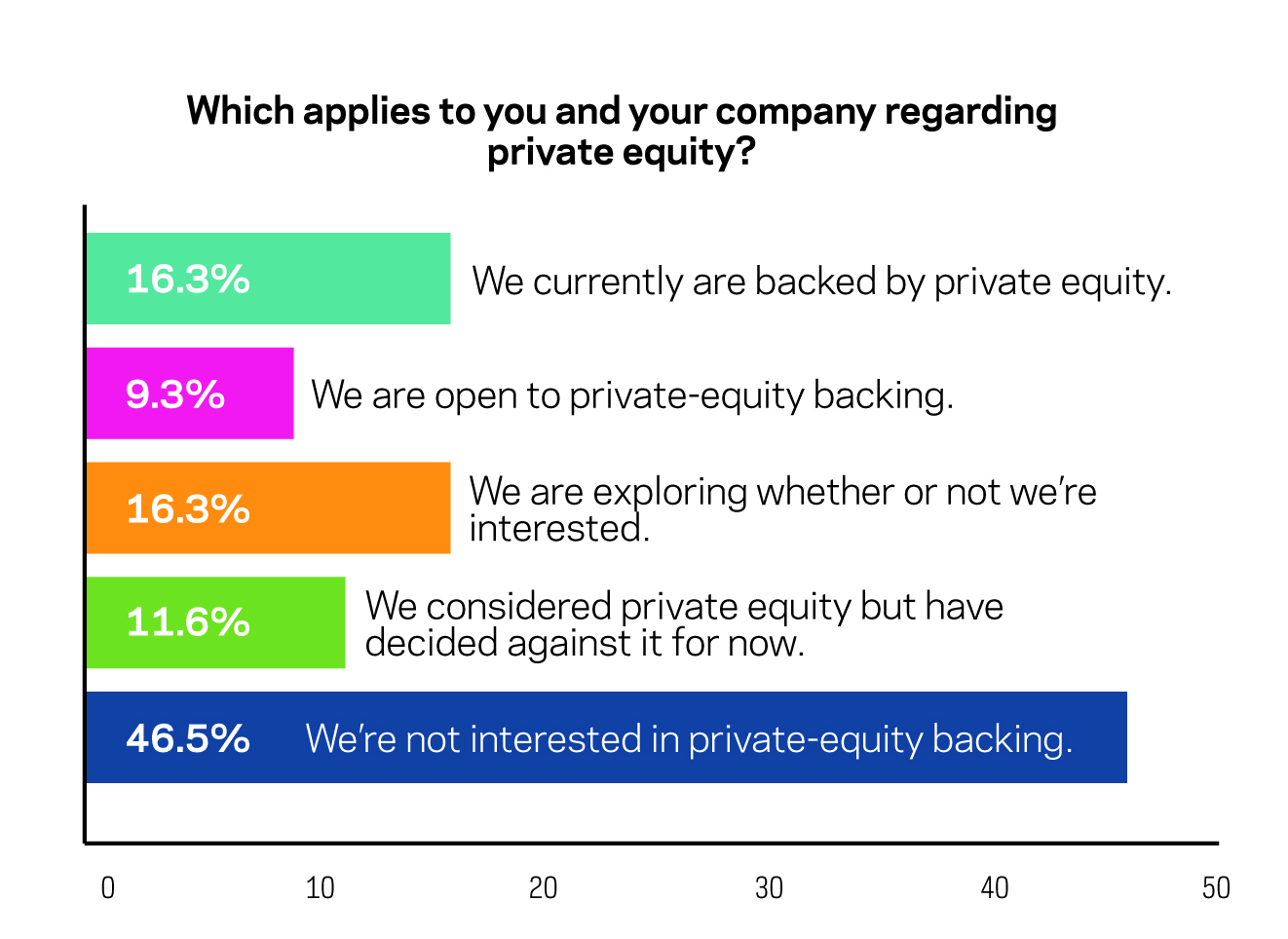 While times are changing, major shifts are generally incremental, and we’re seeing that here. Asked about private equity investment as it relates to their own firms, 16% revealed they already have such backing. But nearly half are not interested in it for their own companies. While private equity and franchising may have set the path for some companies to bridge generations, nearly half of the Top 50 have yet to determine their succession plans.