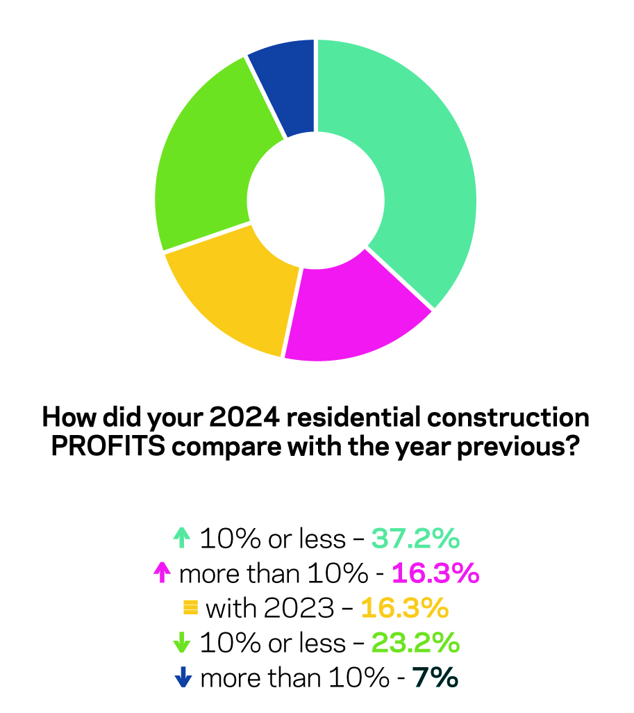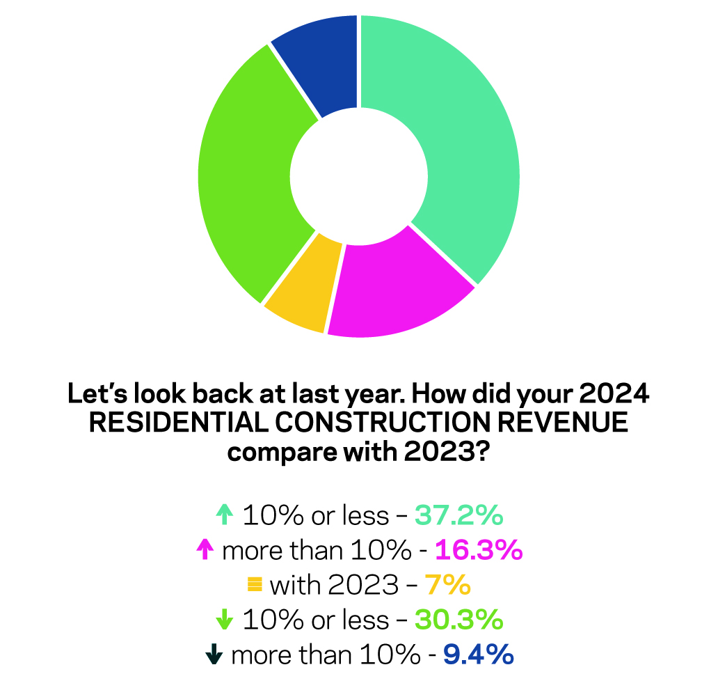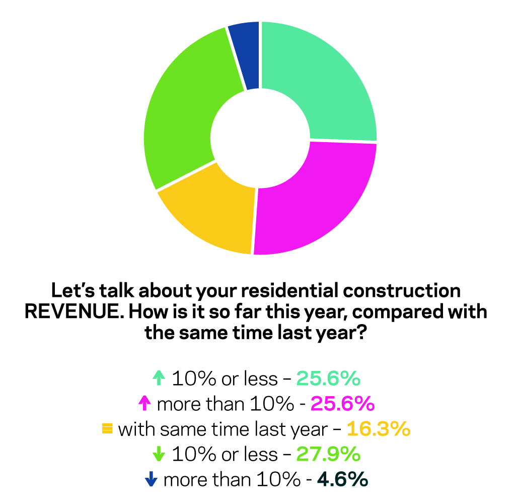Just over half have seen residential construction revenue rise compared with the same time last year. Even among those who saw decreases, they were very small, with 20.9% reporting decreases of 5% or less.