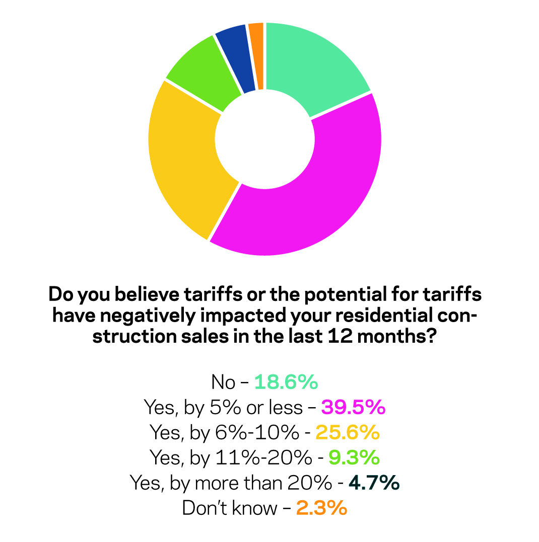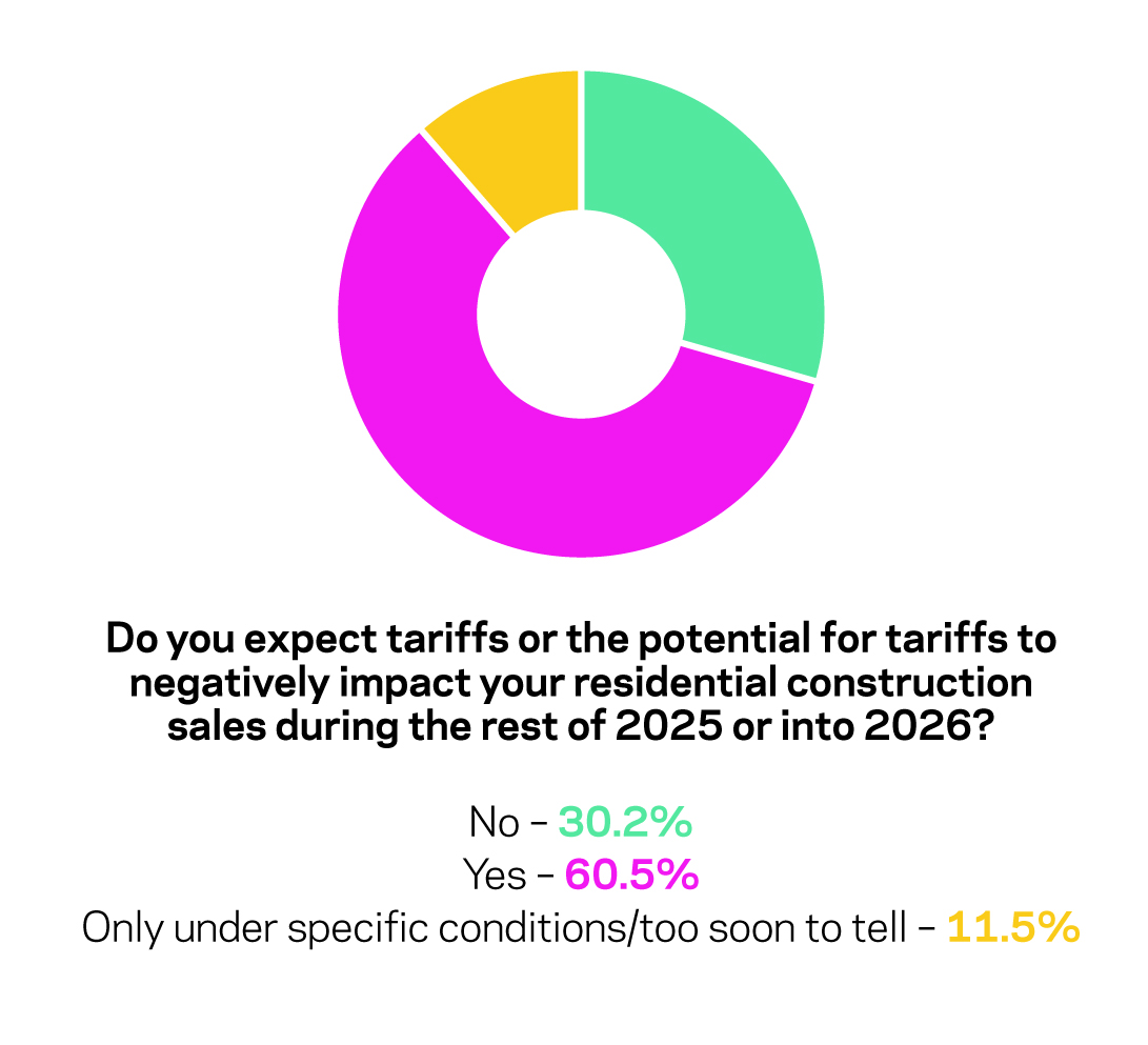 Tariffs remain a concern for these builders, with just under 80% believing their residential construction sales have been negatively impacted by tariffs, and just over 60% expecting them to have such an effect in the near future.