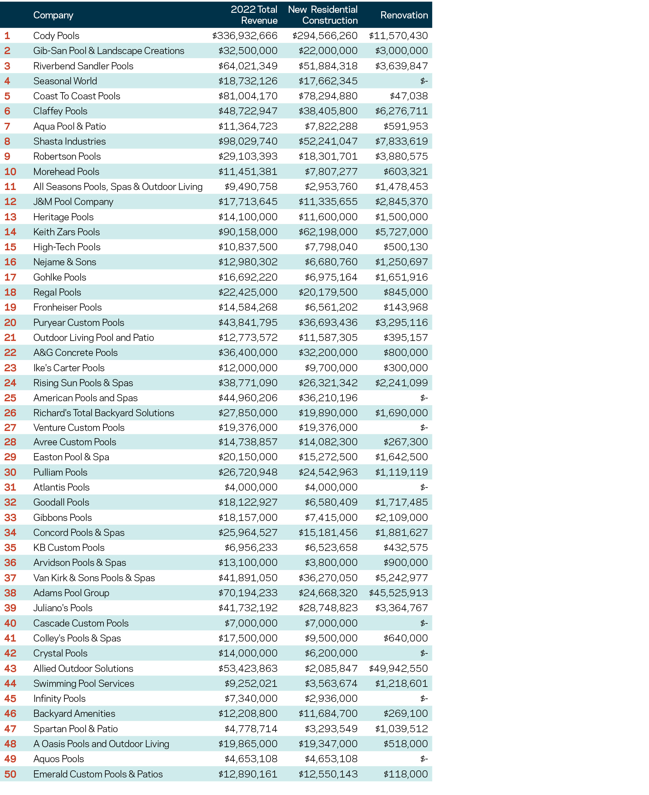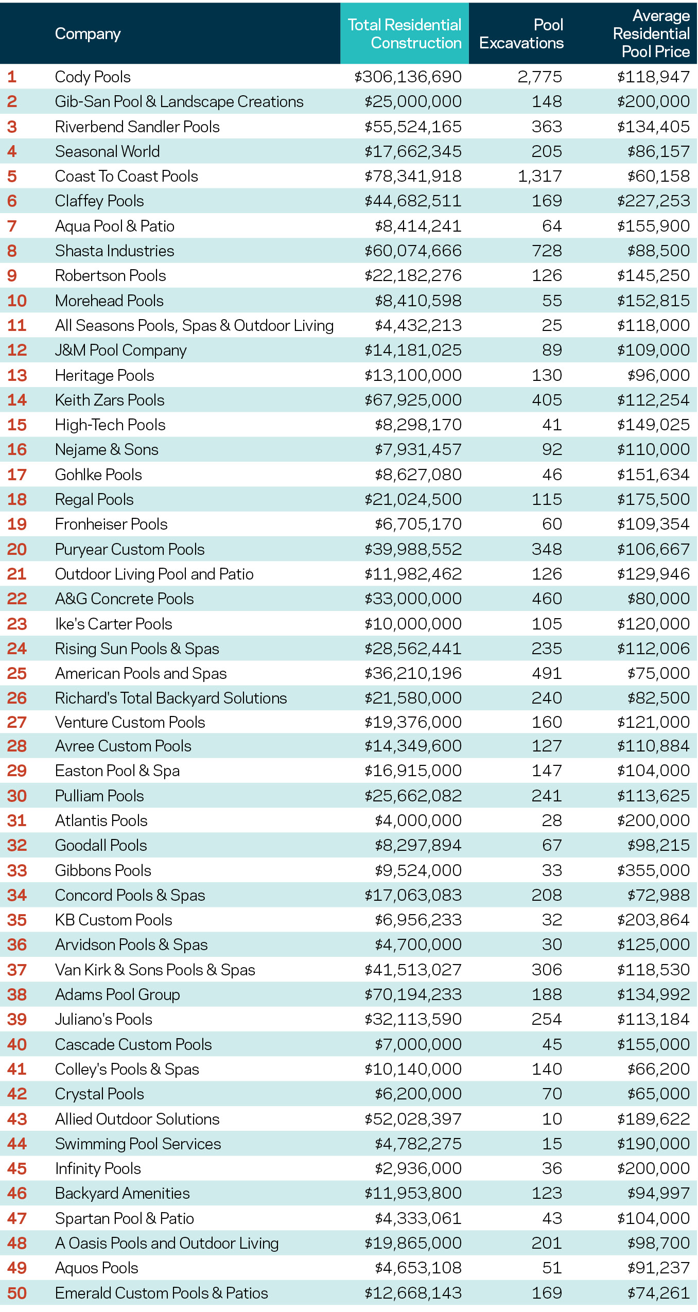 Cody Pools has once again taken the top spot, having only gained strength the past couple years after acquiring two other highly ranking PSN Top 50 Builders — Phoenix-area’s California Pool and Landscape, and Platinum Pools of Houston, Texas.
