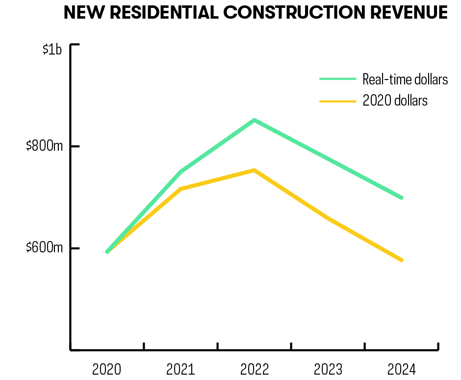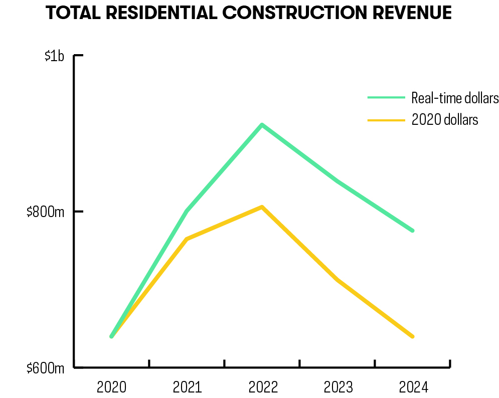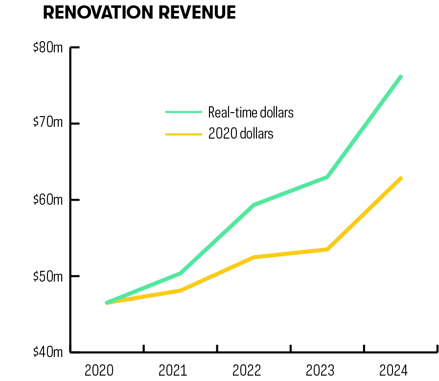 Among this group, new construction still out-earns renovation significantly. However, the two metrics show fairly different trajectories. The curve for New Construction Revenue points downward, reflecting a drop of 23% between 2022 and 2024 (from $753.2 million to $576.9 million, in 2020 dollars). On the other hand, renovations generated much less revenue, but their growth curve moves ever upward, starting at $46.5 million in 2020 and rising to $62.8 million by 2024, in 2020 dollars.