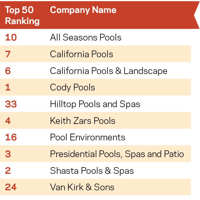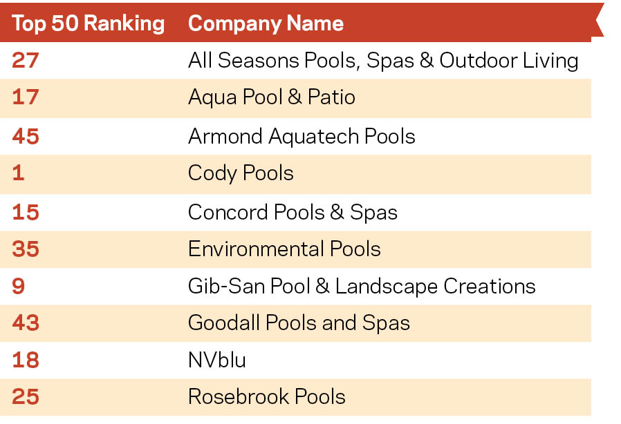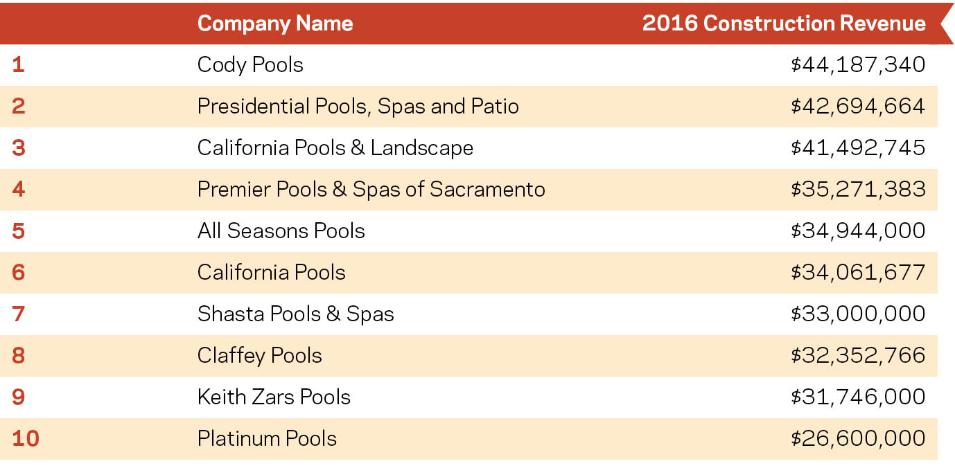 Of the five components on which Top 50 applicants are judged, Total Residential Construction Revenue carries the most weight. This is calculated by adding new residential construction revenue with renovation income. For the fifth year in a row, Cody Pools reported the highest revenue here. For the Austin, Texas-area company, this figure jumped nearly 10% in 2016, from $40.19 million in 2015 to almost $44.19 million.