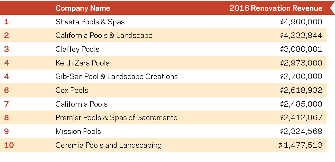 Diversity is still a key to success. However, it is clear that, for these builders, renovation very much takes a back seat to new construction. While our top renovation earner, Shasta Pools & Spas, brought in nearly $5 million from renovation, that compares with $28 million in residential new construction revenue. Of the $775.5 million that the entire Top 50 made from residential construction in 2016, $54.6 million came from renovation work. When it comes to percentage of residential construction revenue generated from renovation, the top builder does not appear on this list. All Seasons Pools, Spas & Outdoor Living, in Orland Park, Ill., derives 48% of its residential construction revenue, approximately $1.4 million, from renovations.