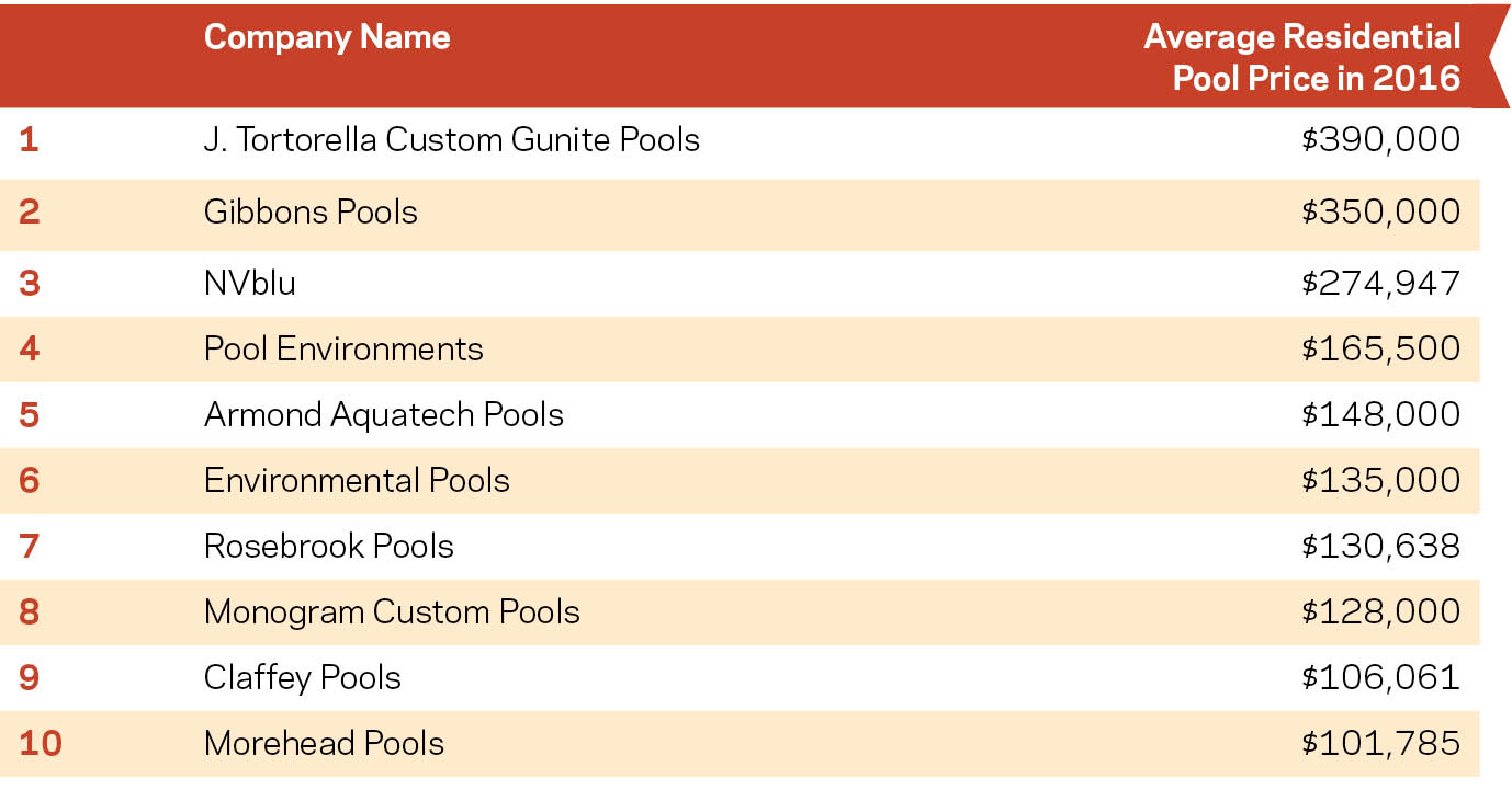 In addition to the high-volume set, the Top 50 includes contractors who veer toward the ultra-luxurious. For the first time, this group of 10 all reported average residential pool prices of more than $100,000. On the other end of the spectrum, some Top 50 builders reported average prices of less than $40,000. Here, the builder reporting the highest average price, J. Tortorella Custom Gunite Pools of Southampton, N.Y., saw average residential pool price increase 11% in 2016 from $350,000 to $390,000. This group has clearly mastered the art of maximizing each project’s potential.