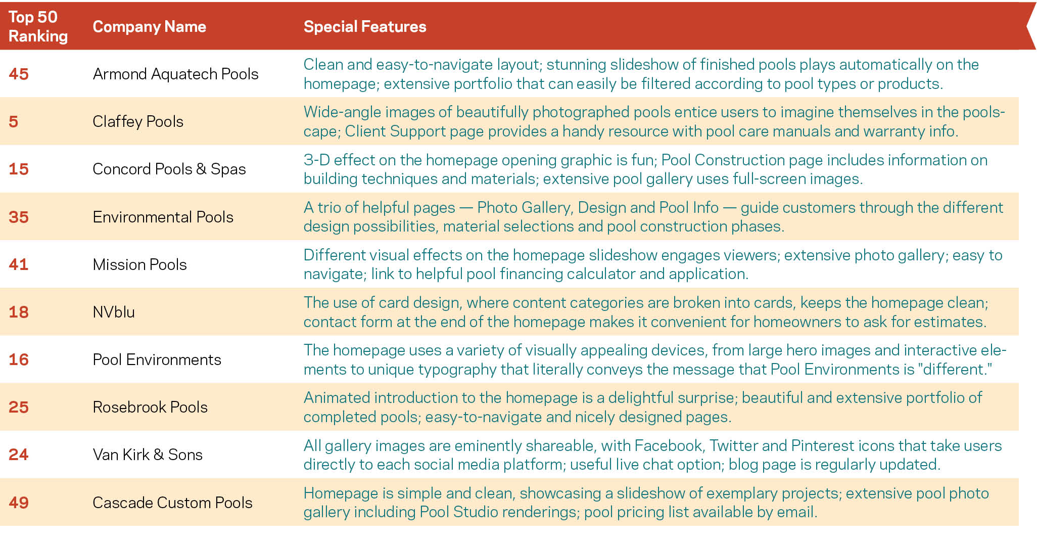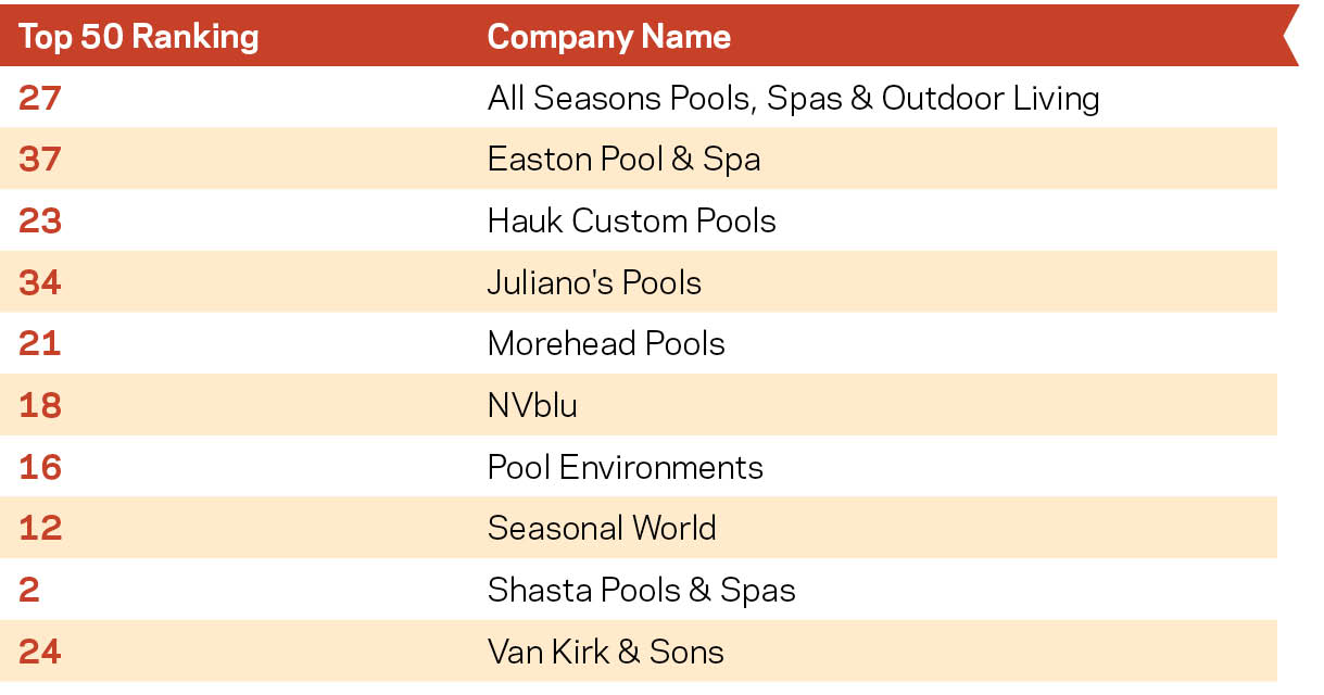 As social media has become a critical line to consumers, particularly the next generation of pool owners, this is considered in the ranking. Builders are judged on engagement, in terms of both quality and quantity. The top scorers are listed alphabetically. The graph at right shows the Top 50’s involvement with major platforms.
