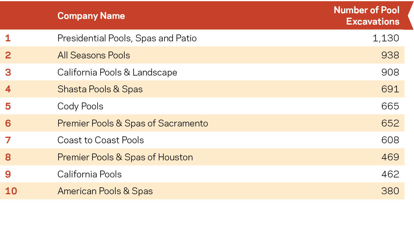 A company’s volume is determined by the number of excavations performed within a year. While this figure is not considered in the judging for Top 50, it is recognized as a key barometer of business activity. This year, Phoenix-area builder Presidential Pools, Spas and Patio topped the group in volume, with 1,130 digs reported. That’s 20% more than the next in line. Combined, Top 50 builders reported 12,548 excavations in 2016, representing a 4% increase over the previous year.