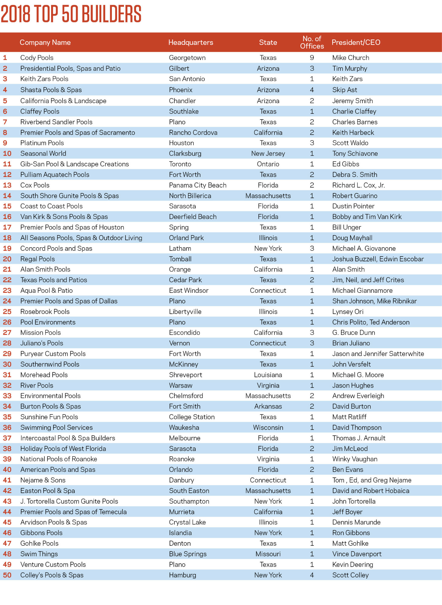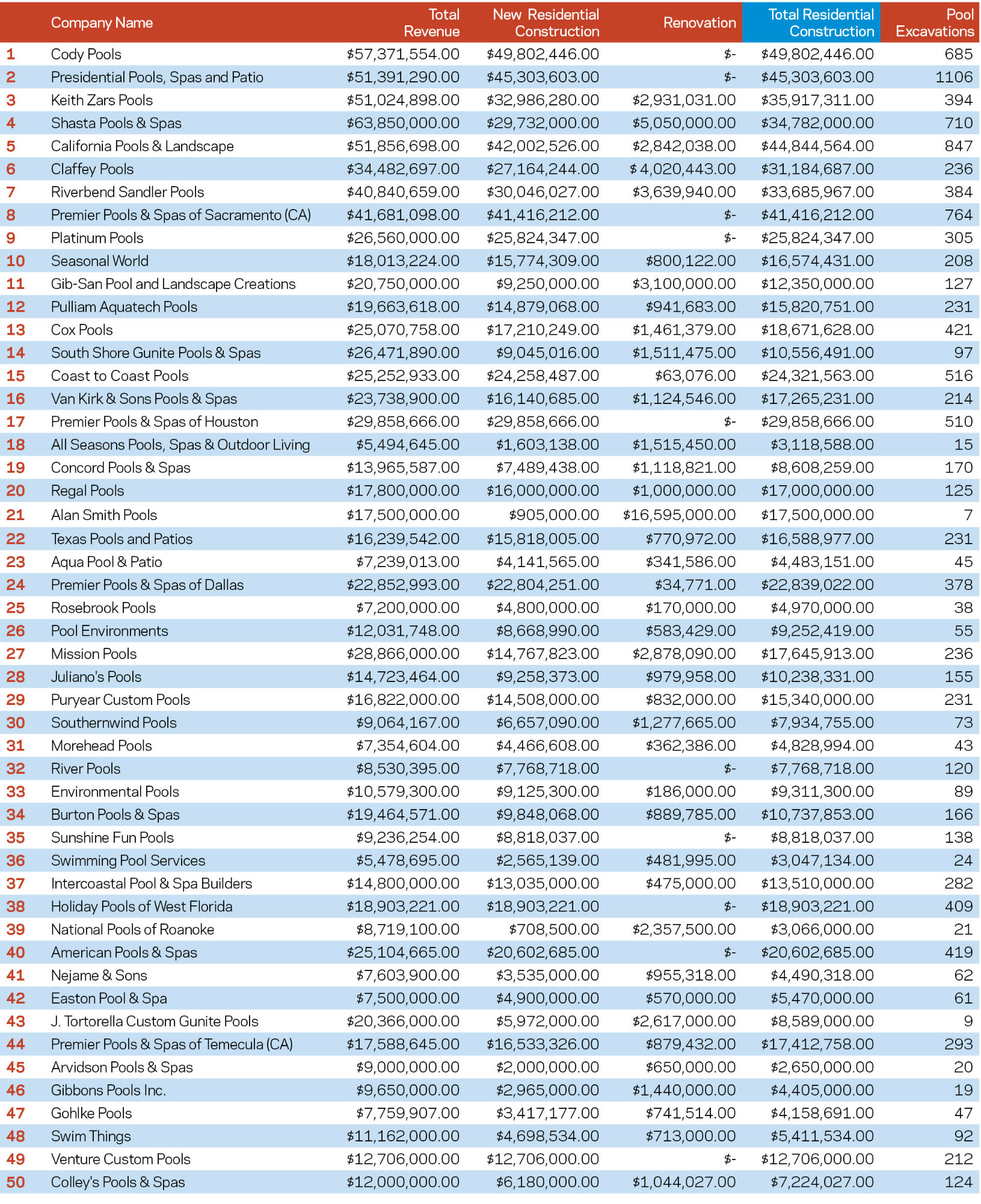 Residential Construction Revenue is calculated by combining earnings from new residential construction and renovations. Of the five judging criteria, this factors in the most. Once again, Cody Pools, headquartered near Austin, topped the list of highest earners. It generated nearly $50 million in residential construction, representing almost a 13% jump from last year’s $44.2 million. Cody is joined by five Lone Star State compatriots in this Top 10 list. Three of the remaining companies hail from Arizona, with the last from California. In residential construction, this year’s group earned $816.8 million, a 5% increase over the 2017 Top 50, whose reported residential construction earnings combined for $777.9M.