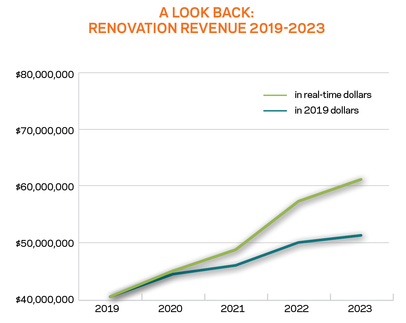 Different from the previous trends, we see here that renovations were still on an incline last year. The builders reported $61.2 million in renovation revenue last year, compared with $57.3 million in 2022. This reflects an almost 7% uptick.