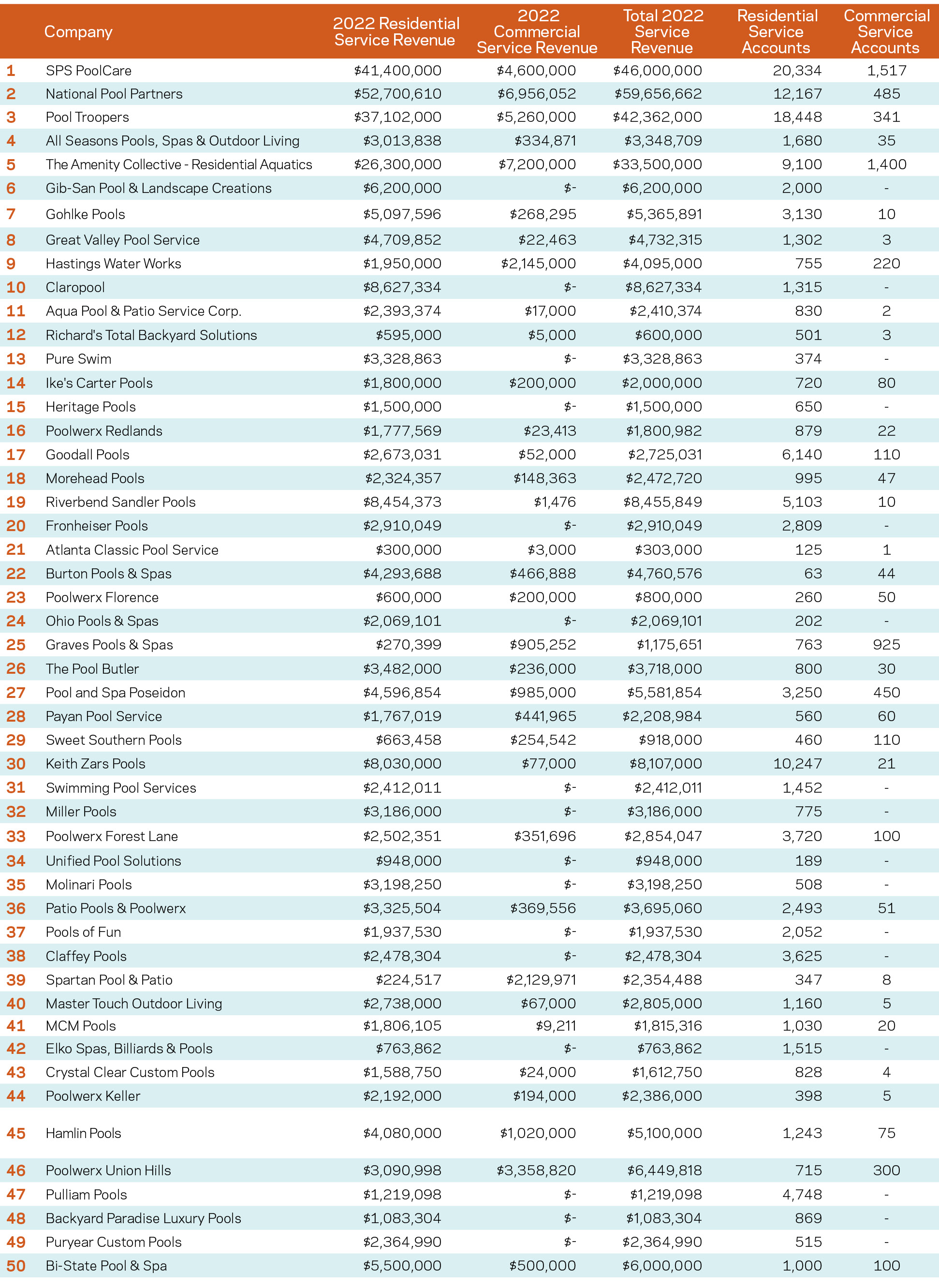 Together they make a significant impact on the industry and pool-owning public, generating $287.57 million in revenues specifically generated from residential pool/spa service. These companies also operate 136 locations around the country, employ 2,622 technicians and serve almost 142,000 residential and commercial clients.
