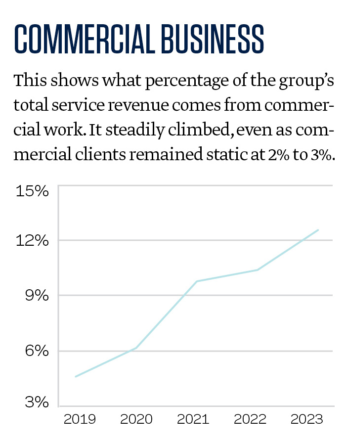 This shows what percentage of the group’s total service revenue comes from commercial work. It steadily climbed, even as commercial clients remained static at 2% to 3%.