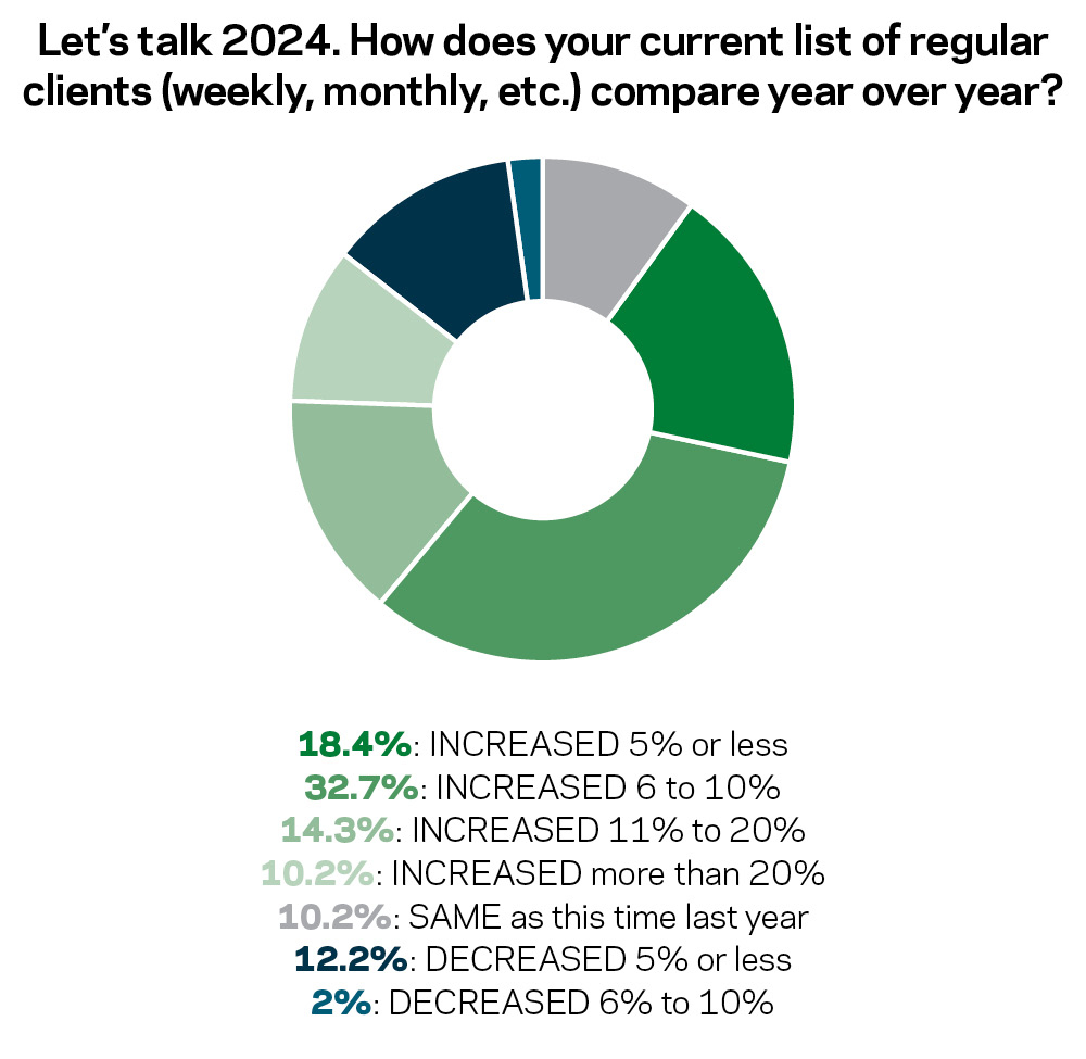 A survey of this year’s Top 50 Service companies reflects a segment as healthy as ever. As charts on this page show, 2024 looks good so far, with most firms reporting increases in revenue and client rosters. While the trend definitely points upward, revenues seem to be increasing slightly more than client numbers, this year and last. And the increases aren’t always moderate. In some cases, significant portions of the Top 50 report inclines over 10% or even 20%.