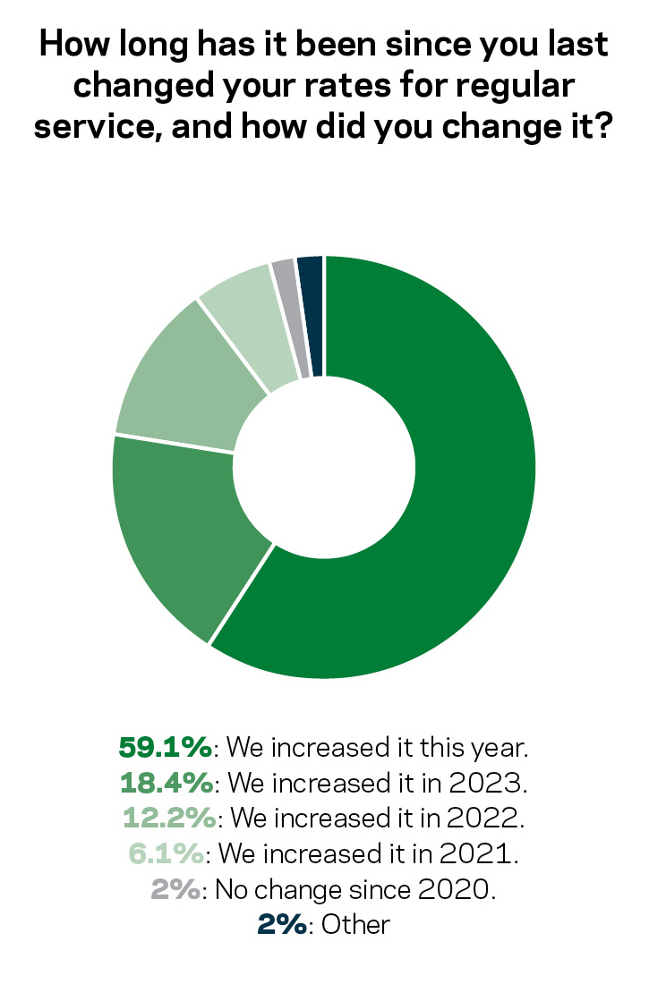 As seen on page 46, this group has not been shy about raising rates. Fully 59.1% did so this year, and another 18.4% instituted their latest increase in 2023.