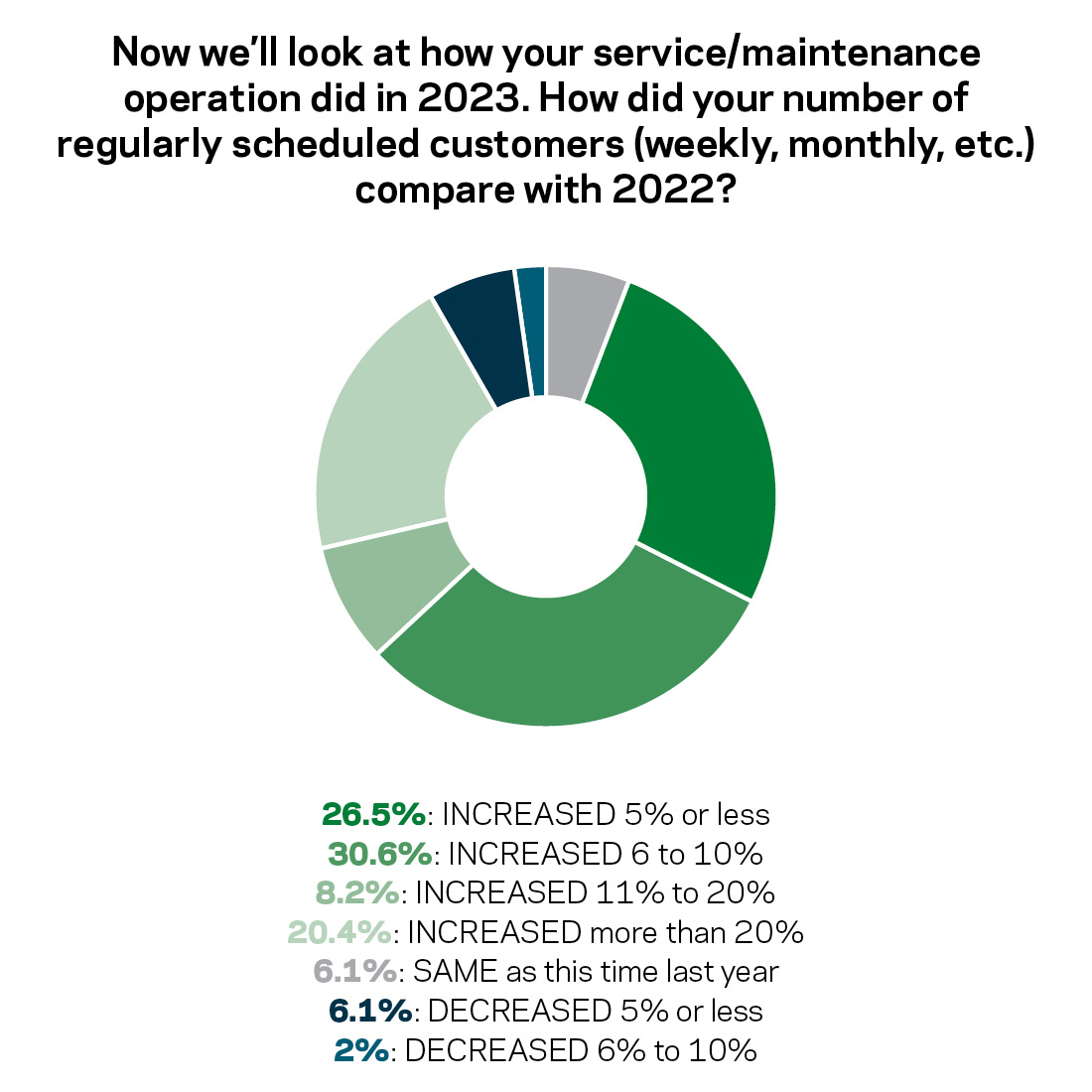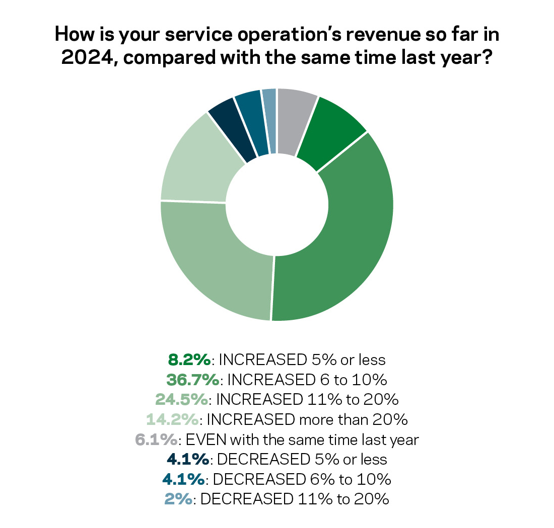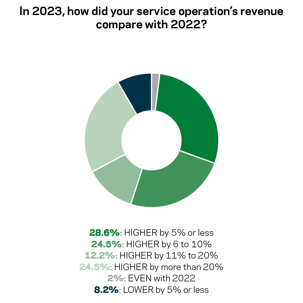 Service continues to increase its mark. Among companies that also offer construction and/or retail, 46.7% said service accounted for a larger portion of total revenues in 2023 than 2022.