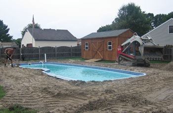 The pool is then lowered into the hole, and sand is shoveled into the hole while wetting it to make sure it compacts completely. This type of compaction cannot be achieved with most other backfill materials, including gravel. Although the gravel may appear to be completely compacted, it is still subject to ground movement and settling over time. Sand, when compacted correctly, will form a very dense, and secure, barrier between the pool and the excavation walls, offering support without jagged edges to scrape against the plumbing lines and the pool shell.