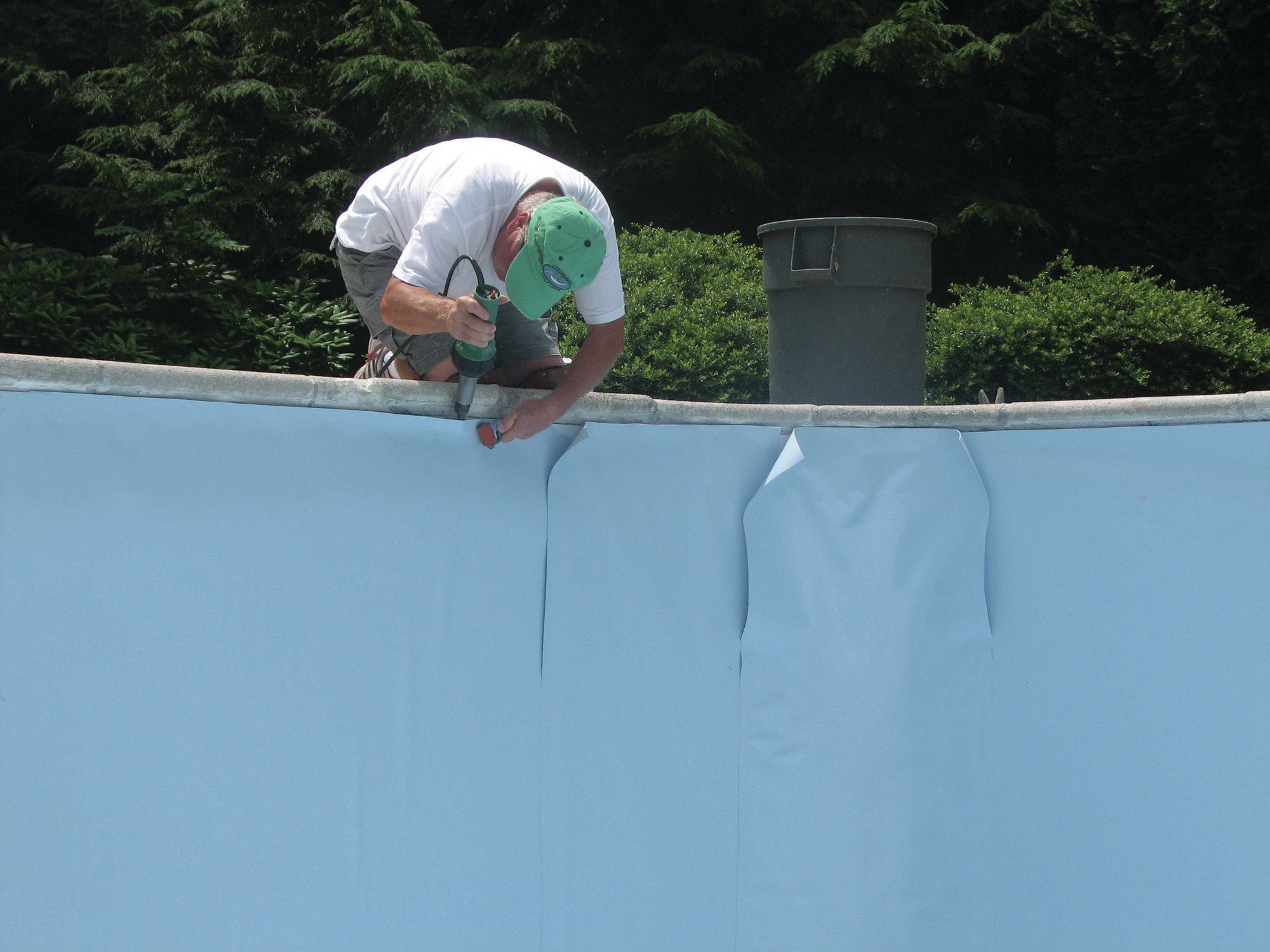 As mentioned earlier, the material is tailored to the pool on-site. Once the pieces have been measured and cut, they’ll be overlapped by two to three inches. Using a hot-air blower, first create a tack weld about an inch and a half inside the overlap to hold the pieces in position.