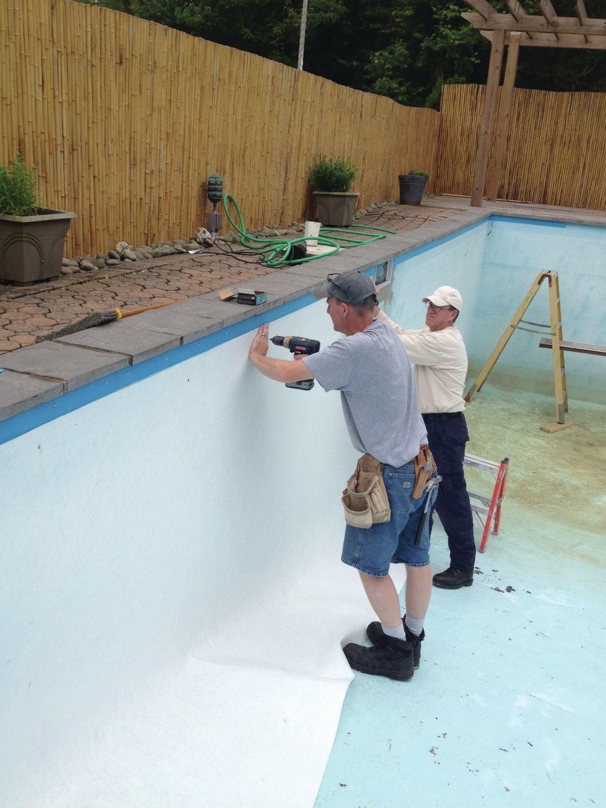 Where things get tricky is around corners and steps where you may need to do a triple overlap of the material. Make doubly sure there are no vulnerabilities. Cut the material around the return lines, drains, lights and other penetrations and affix stainless steel fasteners around them.