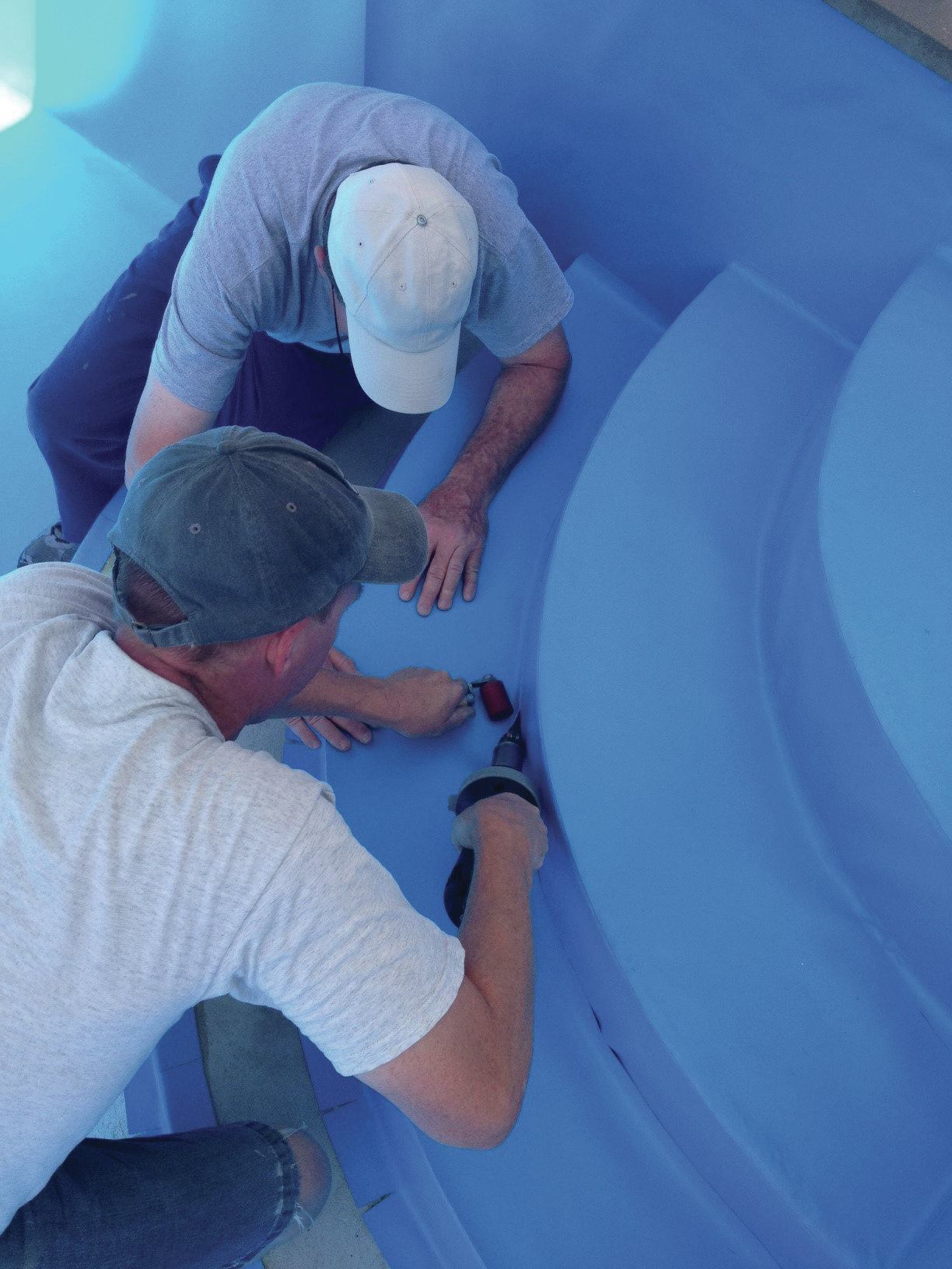 “It’s easy once you’re trained and have a little bit of practice,” says Carol Payer-Cooper, sales and marketing manager for Park Pool and Pond Products. “If you’re not experienced with this, I would not recommend that you say ‘Yeah, I’ve used a welding gun before. I think I’m going to go out and do a pool.’ You need to make sure that this is watertight and there’s a definite process to ensure that.”