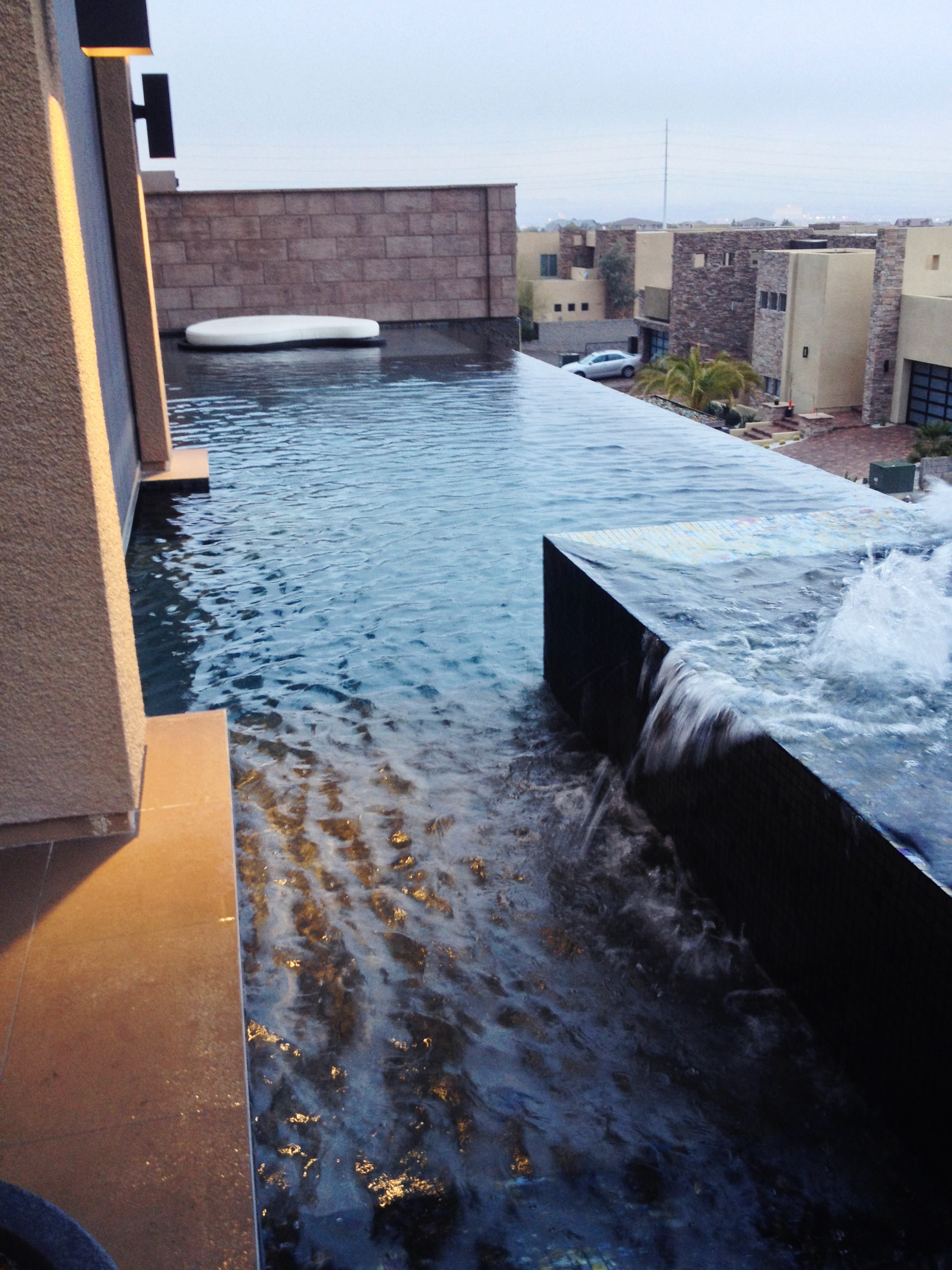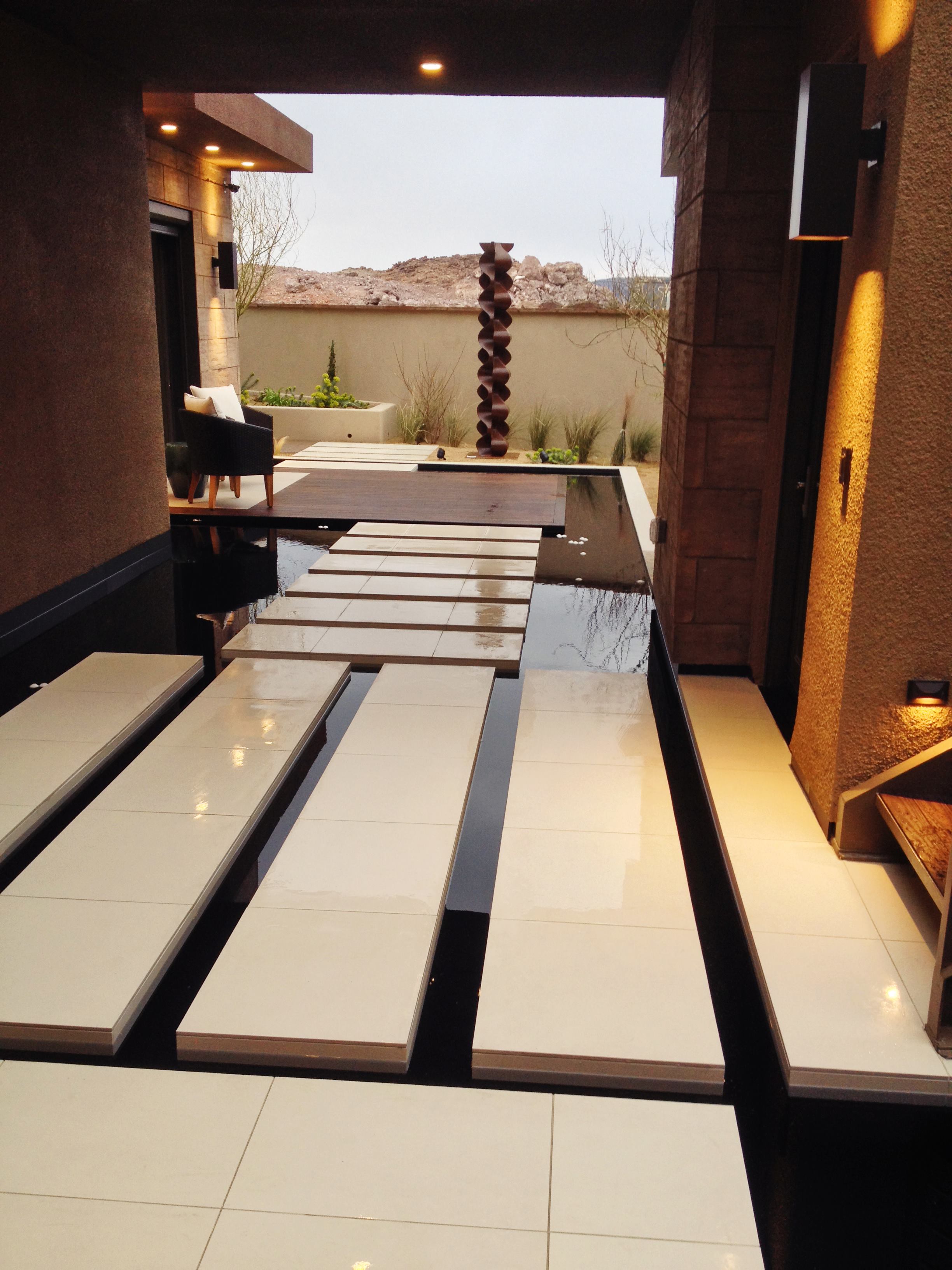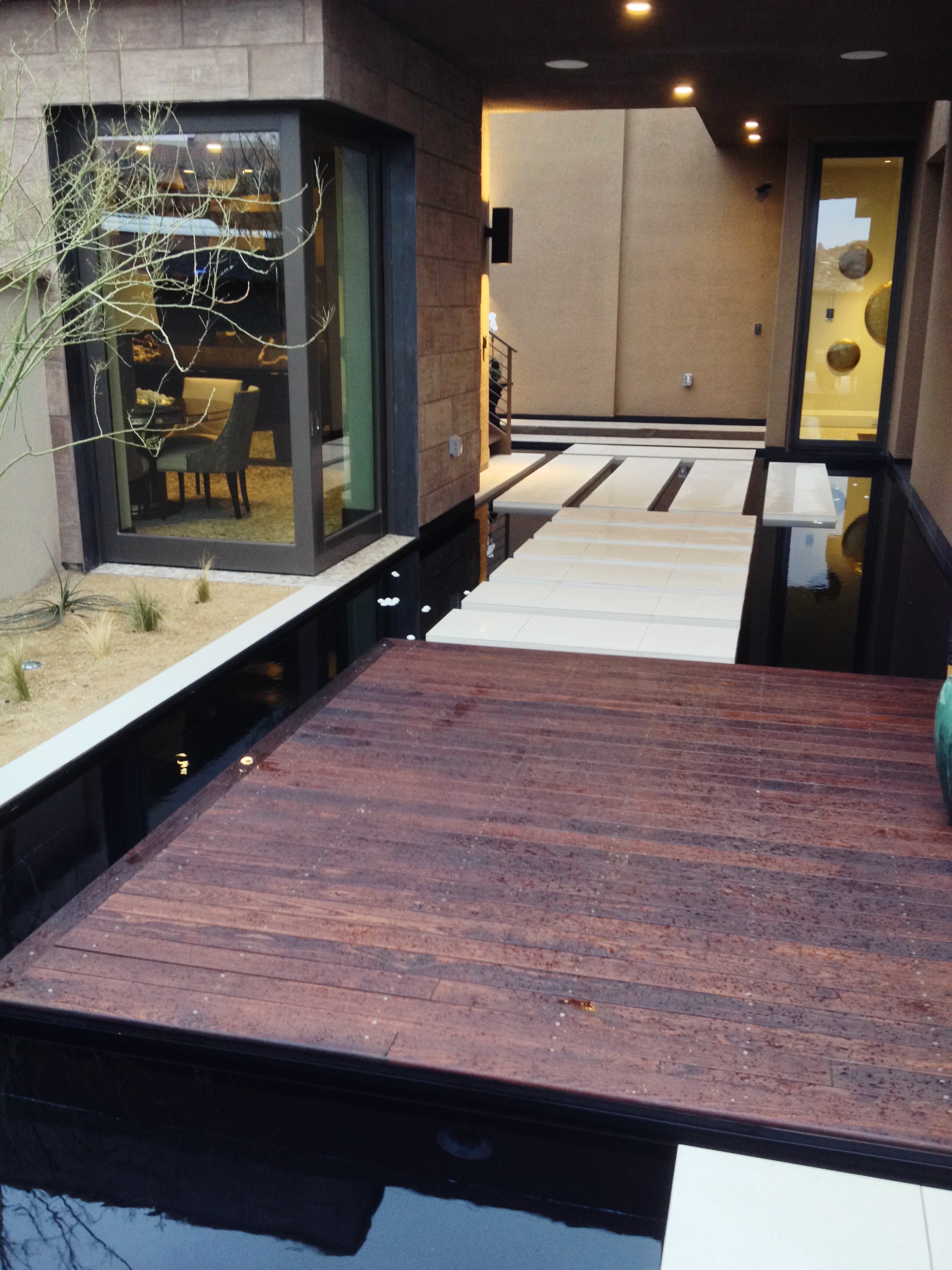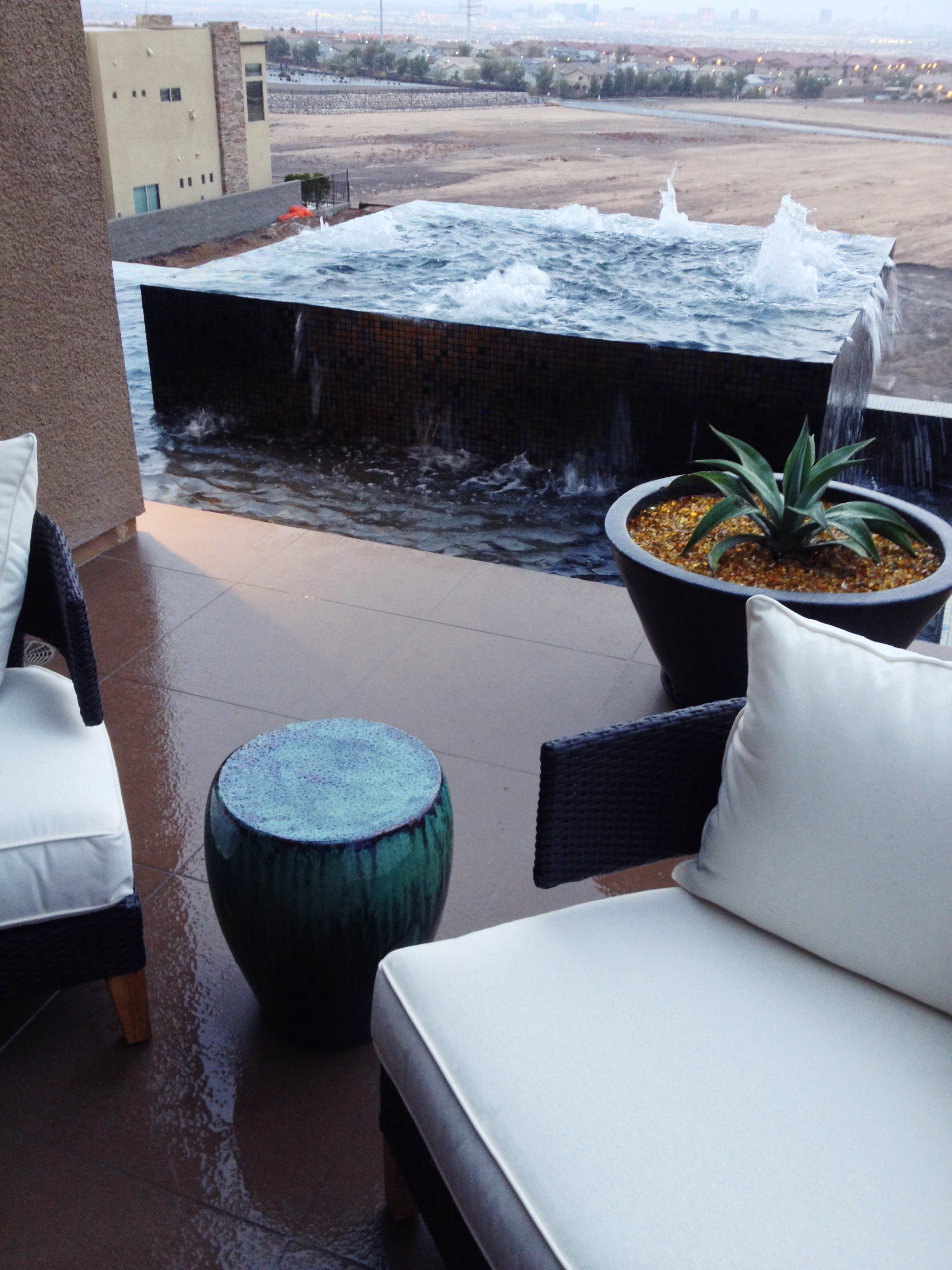 For the third time in six years, “The New American Home” features the work of Doylestown, Pa.-based Anthony & Sylvan Pools. The official showcase house for the International Builders Show debuted in February during the 31st Annual National Association of Home Builders event in Las Vegas. Anthony & Sylvan is the first pool builder to be selected for the honor three times. The home’s waterfeatures begin at the front, where a reflection area greets guests. From there, it flows around a pathway and leads to a “floating” sitting area. Water also glides around the walkway from the atrium to the main part of the house, and eventually touches key areas, including the master bedroom. Visible from the entryway, the 772-square-foot concrete infinity pool in the backyard features a black pebble finish and glass tile at the waterline, plus two 10-inch wet deck lounges and an in-water bench. A raised, built-in hot tub has 360 degrees of water cascading into the pool below, while a seating area just outside creates a cohesive entertainment spot between the yard and pool. Built in the foothills of the Sky Terrace housing development in Henderson, Nev., the 6,700-square-foot multigenerational show home is meant to demonstrate concepts and best practices for energy efficiency, as well as NAHB’s green building, building materials designs and construction techniques.