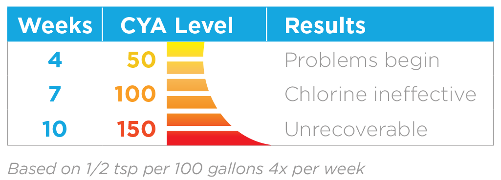 CYA keeps the chlorine in the water up to eight times longer. Pools that used to need daily chlorine additions now only need chlorine once a week with CYA. However, chlorine in the water quickly binds to CYA and a smaller portion of the chlorine is available. So, the chlorine is around longer but it does not kill as quickly. And as the CYA increases, there is less and less chlorine available for killing bacteria and microorganisms.