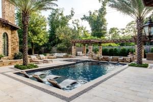 But even though the pool configurations are modern and inventive, Anderson has noticed that customers are calling for classic color combinations when it comes to their backyard furnishings. They’re opting for neutral tones of stone, aquamarine and ocean blue with colorful pops of red and rust orange on pillows and cushions. The color combinations really give the backyard that resort feel, and strategically placing those pops of bold color across different segments of backyard furnishings “carries the color across the yard and aesthetically adds to the design,” says Anderson.