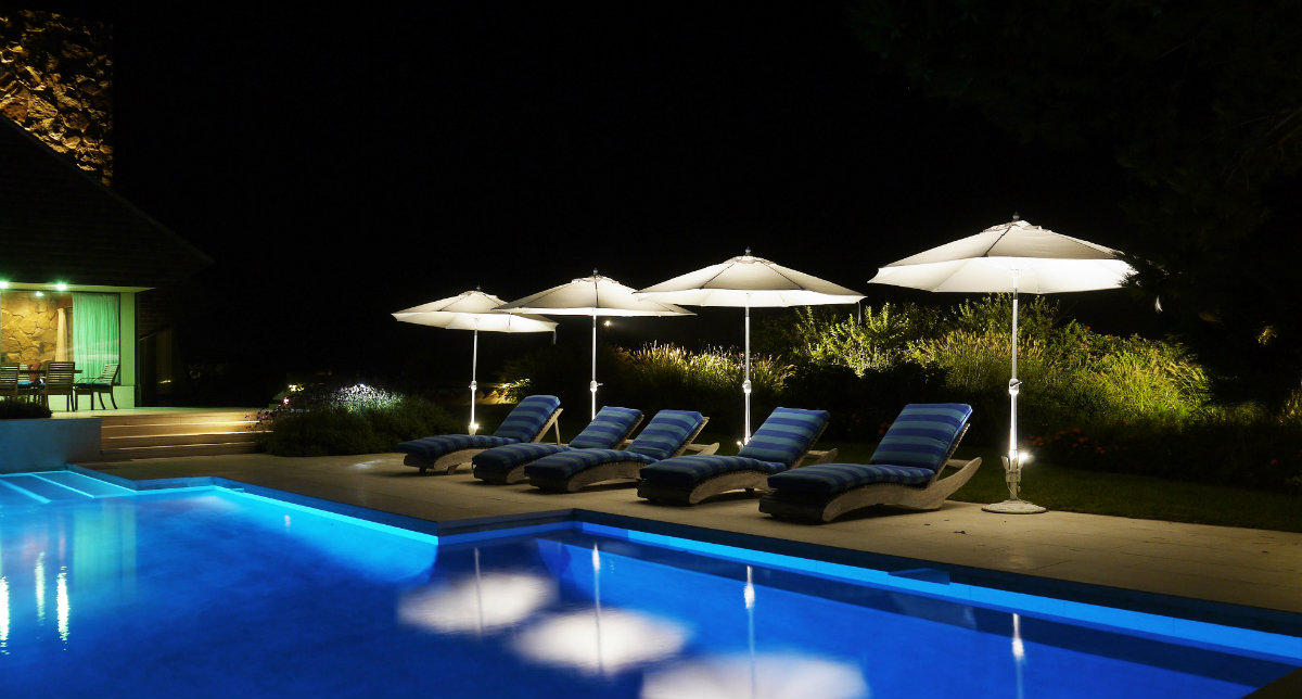The lights are wired to a junction box in the grass at the back of the pool. This way, the homeowner can freely move the umbrellas about the patio and unplug them when it’s time to stow them away for the winter.
