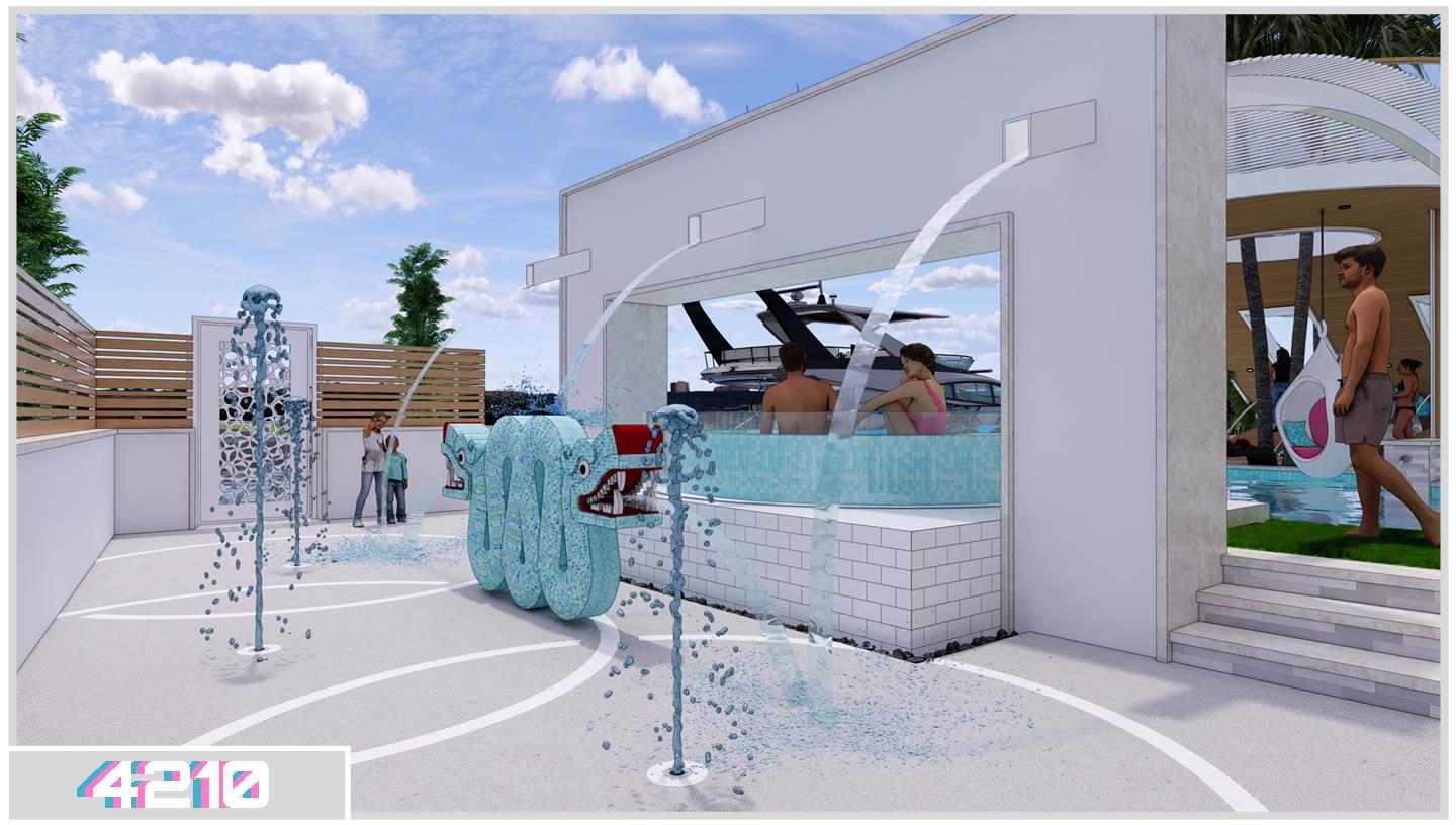 Holley put the main pool next to the structure, with an acrylic spa across from it, set on the centerline of the hardtop structure. The pool floor features a tile mosaic of Frida Kahlo, as just one of several works of Latin-inspired art. Another such piece could be found at the splash pad, which featured a South-American two-headed serpent sculpture.