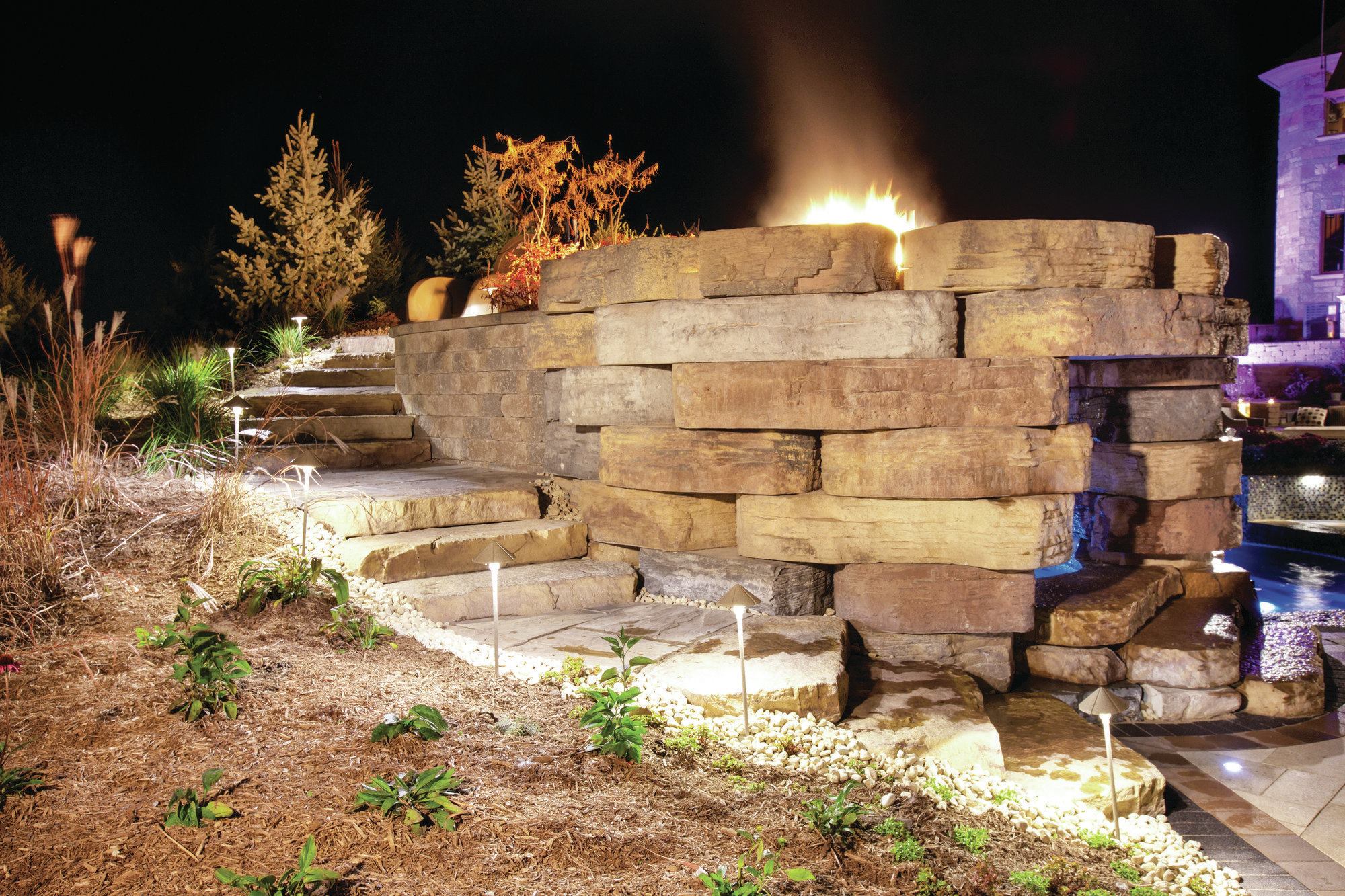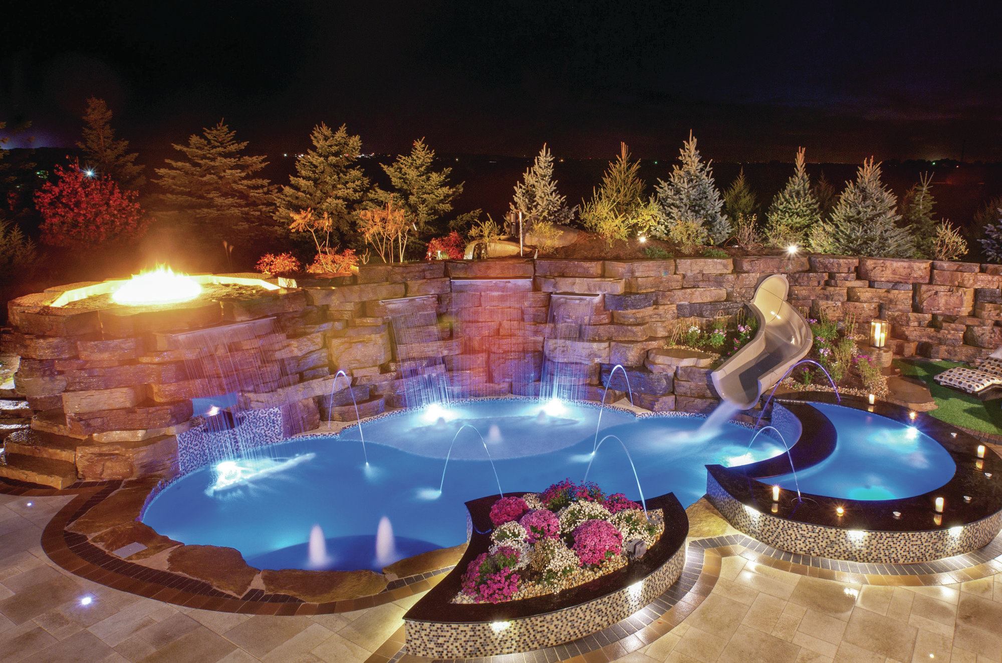 This trend is becoming popular around the country. “I’ve seen [us] going to a slightly smaller pool and we’re putting more money into the amenities around the pool,” says Bob Fergione, San Juan Pool’s regional sales manager for the Mid-Atlantic states and a builder. “We handle landscaping, irrigation, fencing and waterfalls. We’re doing a lot more natural waterfalls coming into pools, along with outdoor kitchens and fireplaces.”