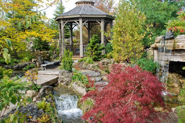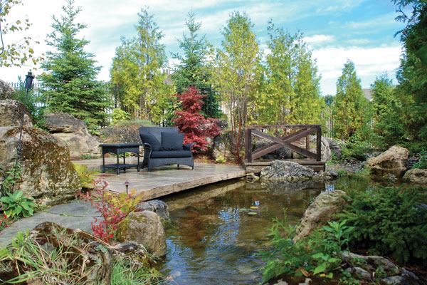 The large trees also help provide a visual buffer and introduce an element of intrigue. I wanted to compel people to explore the whole backyard. From the pool area, you can’t see the beautiful stream and waterfalls that flow toward the gazebo. You wonder what is back there, and feel compelled to walk and explore. As the view opens up behind the spruce trees, it’s like the old storybook scenario — with every page you turn, a little more is revealed.