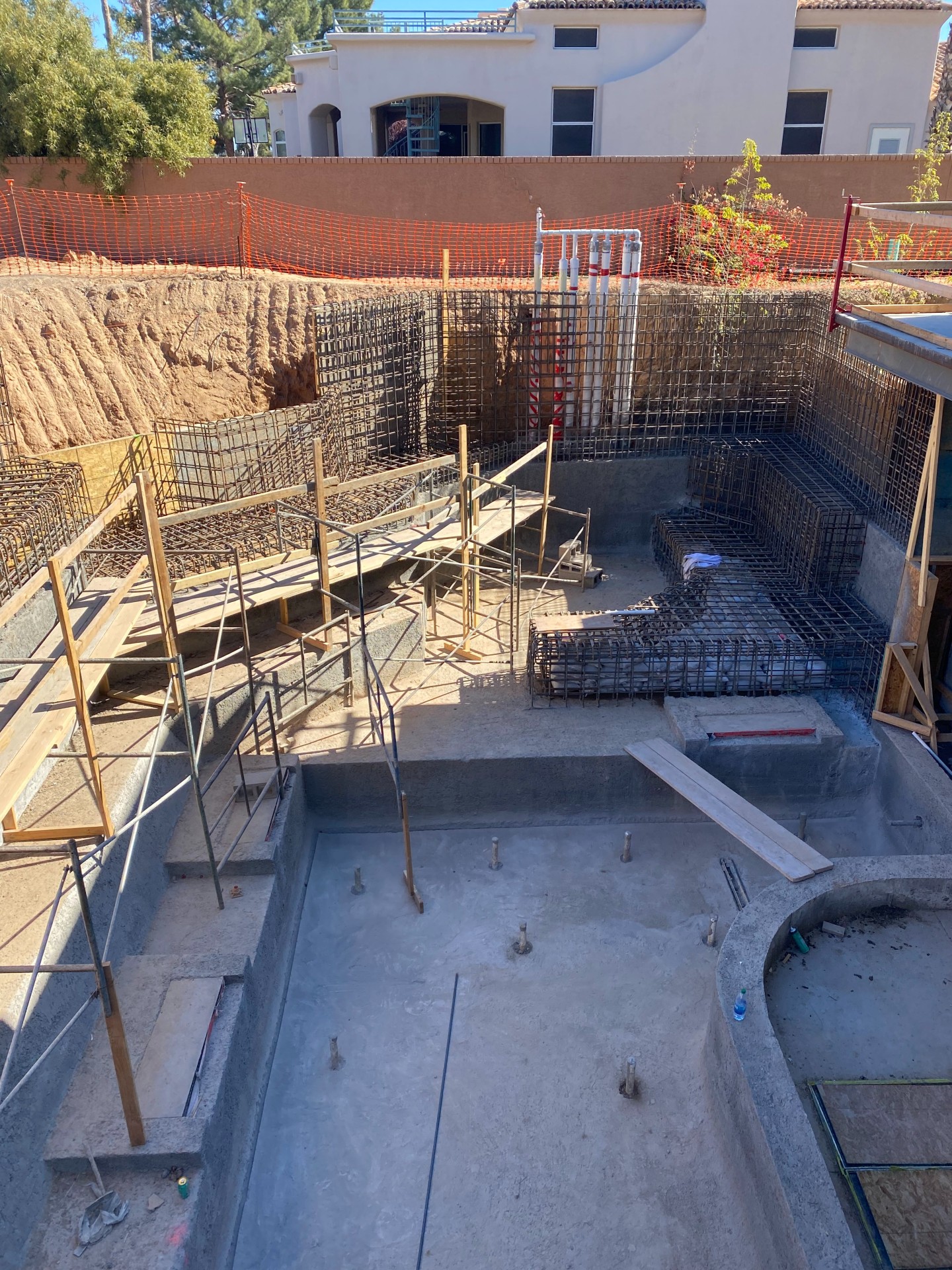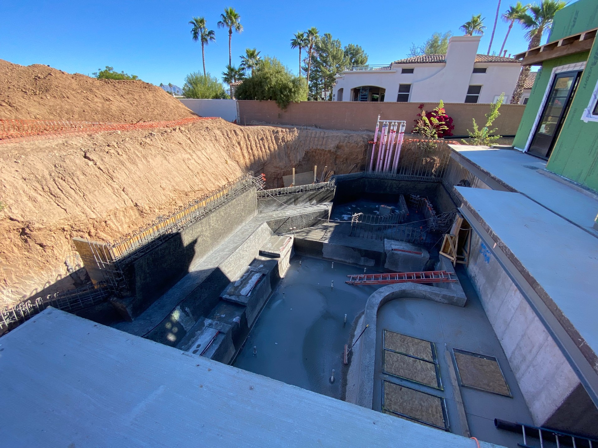 From the back of the main pool, a waterwall spills down to a basement pool that sits just outside the shark tank room. That weir wall and basement pool are completely shotcreted, as well as about 75% of the ground-level pool structures — the main pool, grotto area and swim-up bar area. These latter parts have the steel in place, and we’re now starting to connect that into the beginning of the river and surf simulator, which we’ve just excavated.