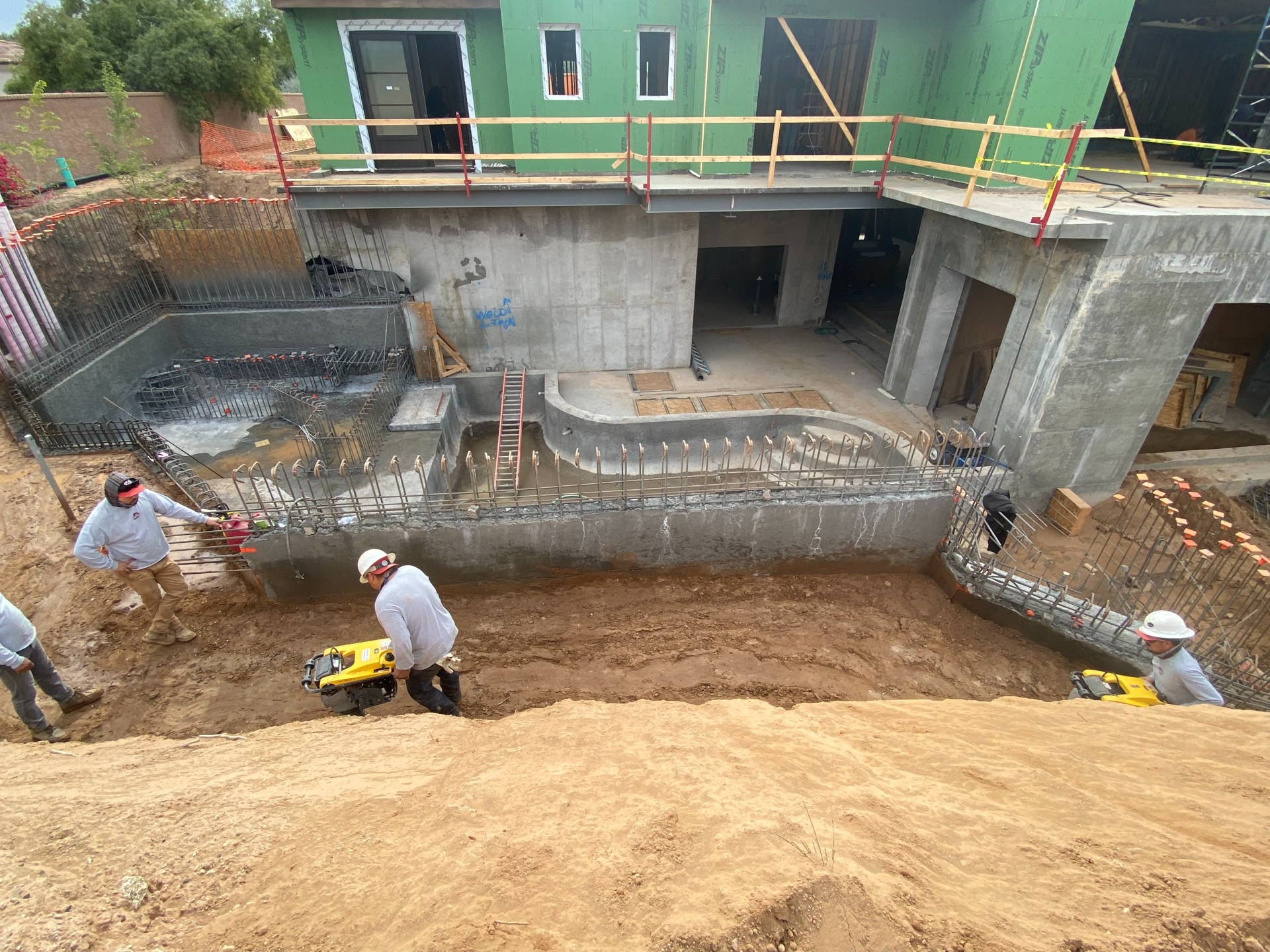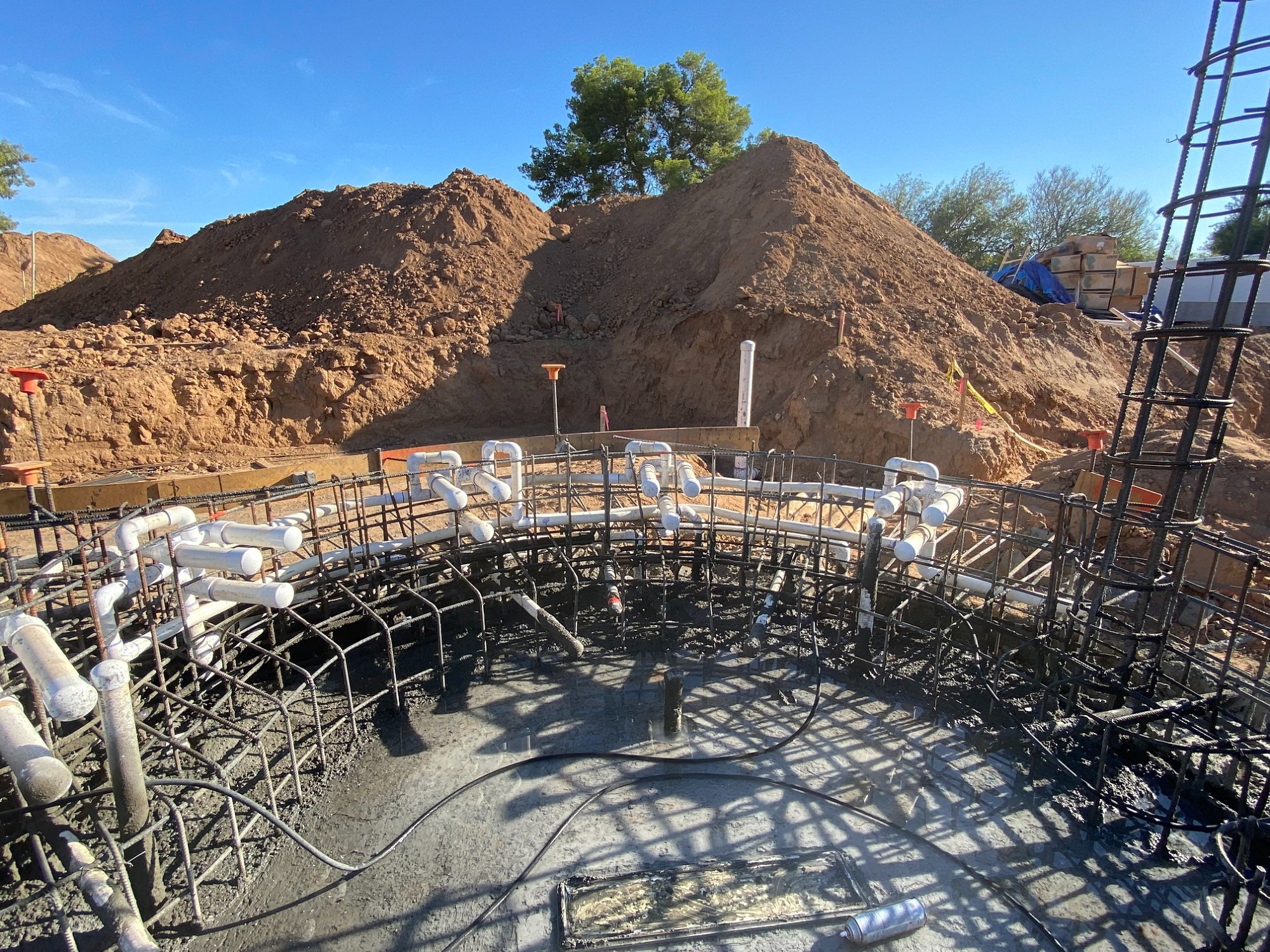 To do this, we’ve had to bring shotcrete crews on site 12 times so far, and they’ll come back probably another 10 more times. We’ve had a shotcrete crew scheduled every seven to 10 days to keep up with the construction schedule. We do this for several reasons. We can shoot 30 to 65 yards a day, depending on the complexity of the area. With supply-chain issues, we can’t always receive all the concrete we need at once — we may want 70 to 80 yards, but only have access to 40. So we split shoots into two days. After they shoot a section, we prepare for the next area — meaning excavation, steel, electrical and plumbing.