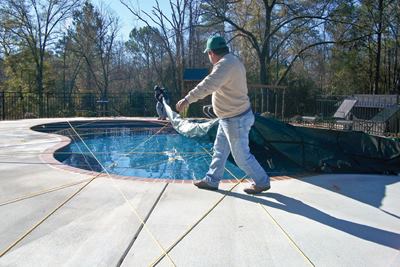 When positioning the safety cover, start with the areas around obstacles. Make sure all cutouts are lined up perfectly, then adjust around the perimeter of the pool.