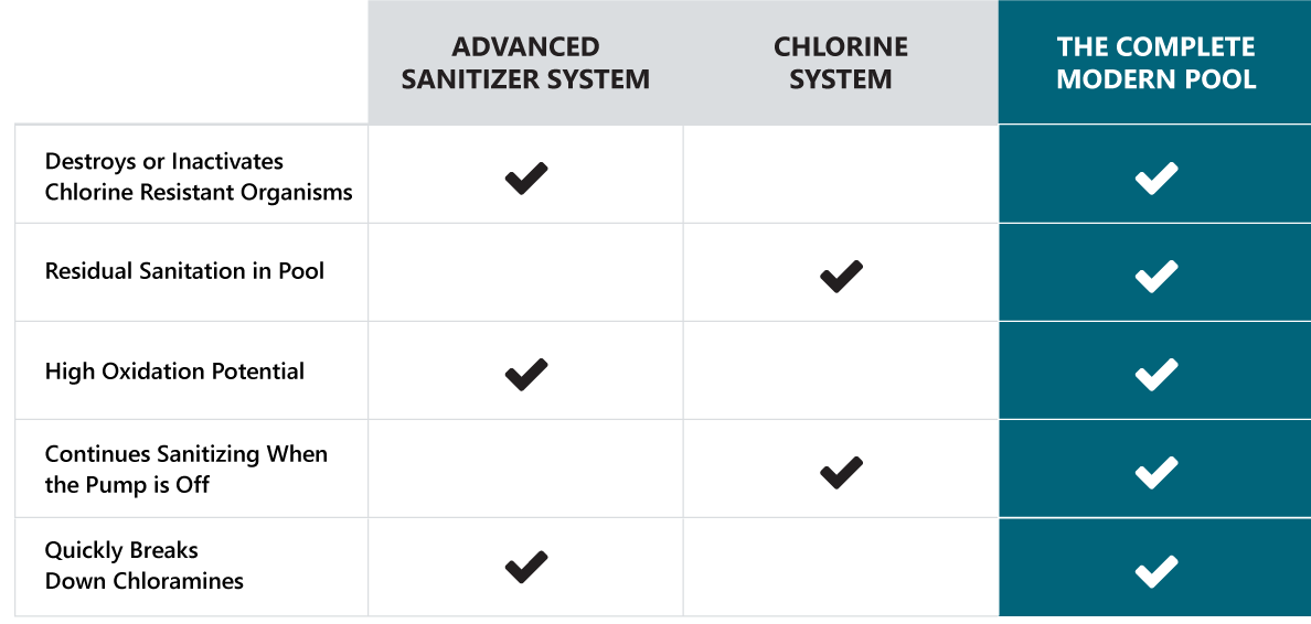 It’s time to move beyond asking if a pool needs either a traditional treatment or a newer sanitizer system. The best results come from using both. This is what makes a “modern pool.” In a modern pool, a proper residual in the water keeps the pool safe, while a secondary sanitizer breaks down chloramines, destroys dangerous microbes and increases water clarity. Chlorine is free to do what it does best, while Ozone, UV or AOP pick up where chlorine ends. And while “chemical free” may be an unattainable dream, the secondary sanitizer can dramatically reduce the amount of chemical that must be added to maintain a safe residual.