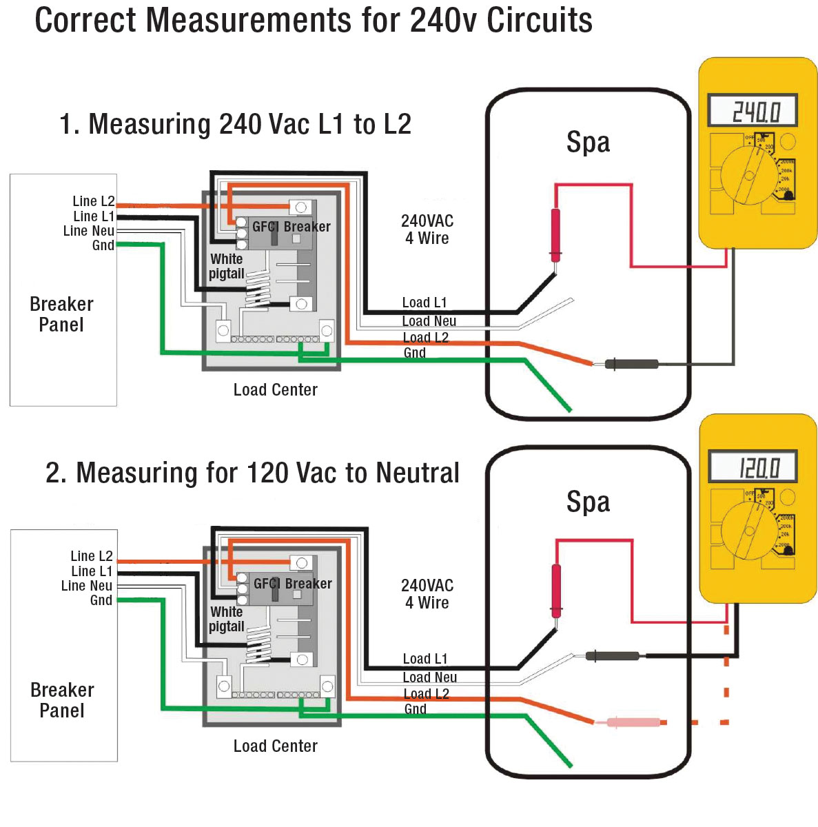a. If voltage is not correct (240VAC from L1Black to L2Red and 120VAC from Neutral White to L1 and L2, 120VAC from ground to L1 and L2, 0VAC from ground to neutral) and the breaker/GFCI is “set,” call a licensed electrician to evaluate service.
