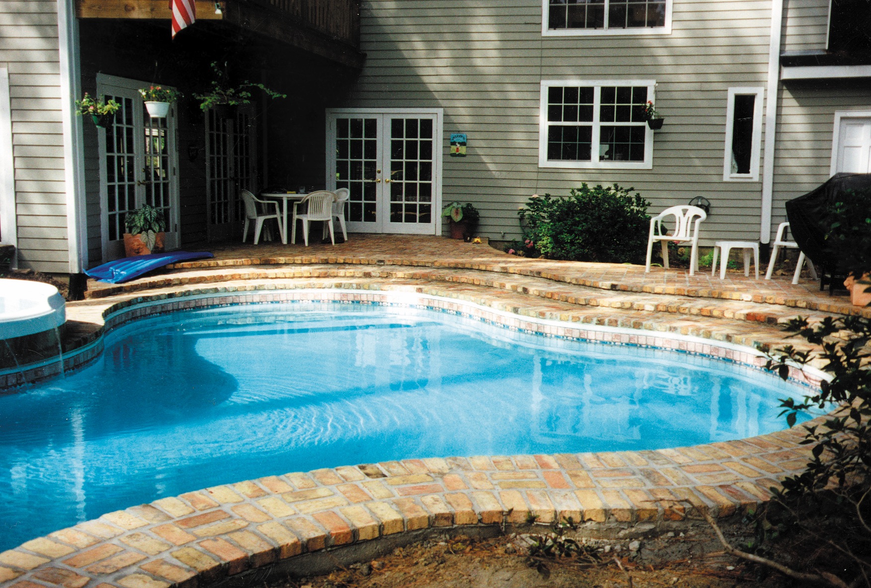 8. The liner’s in place, the pool filled with water, and the brick deck has been installed. The project is complete.