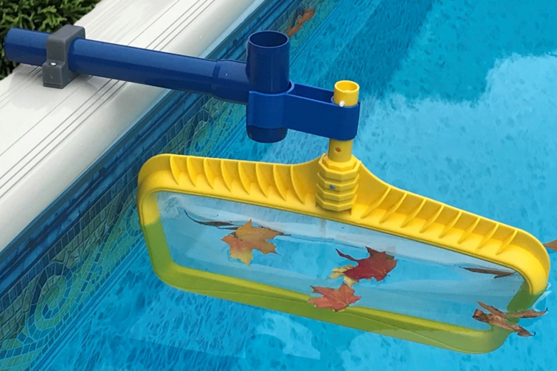 Leaf Bone’s Above Ground Pool Leaf Skimmer Kit is designed to hold a leaf rake net for skimming the pool water’s surface. It attaches to the pool top rail and holds a leaf rake net (purchased separately). The net will accumulate floating leaves and avoid plugging the skimmer.