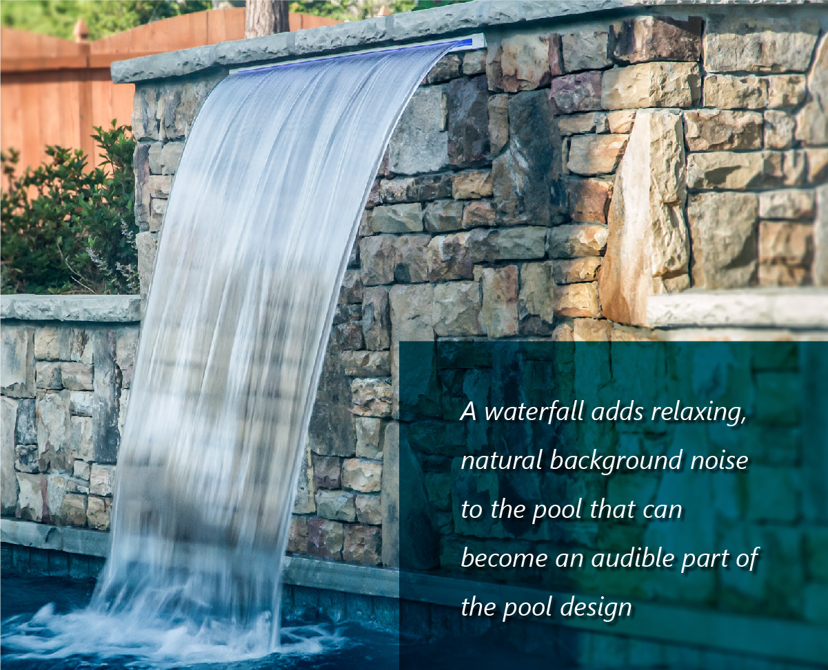 Ambient waterfall sounds. A waterfall adds a natural background noise to the pool that can become an audible part of the pool design. The white noise can be soothing while drowning out other neighborhood or road sounds. The background noise also creates a great sense of privacy in the pool.