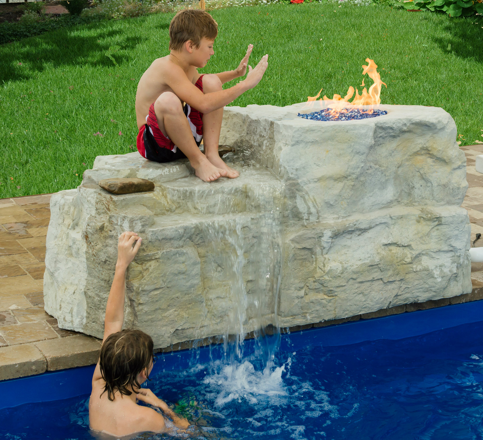 The new Jumper Plus waterfall is made of pre-cast lightweight concrete and is ready to “plug and play.” Part of RicoRock’s newly acquired Waterfall Creations line, this 3-in-1 waterfeature sports a small waterfall and optional fire effect that can be covered to transform the unit into a jumper rock. A cavity below the waterfall hides the plumbing and propane tank. Jumper Plus was developed for retail stores and pool service companies trying to fulfill a wish list on a tight budget.