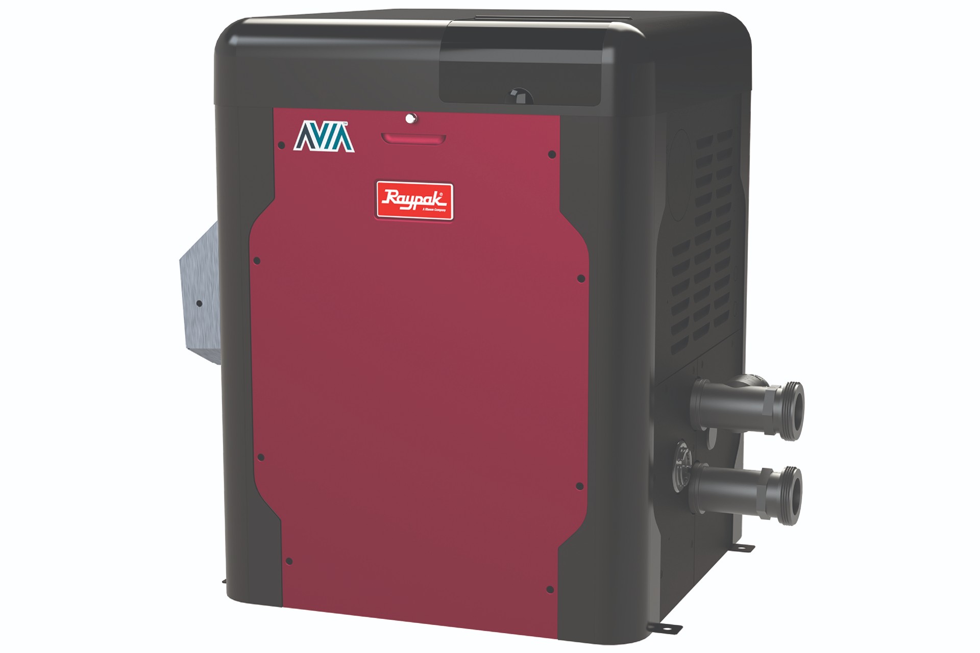 The AVIA pool and spa heater features a built-in Wi-Fi control system that can be controlled by the Raymote app. AVIA can be set up with automation on temperature setpoint, scheduling, and one AUX on/off water feature. It weighs 140 pounds, and can be installed by one person.