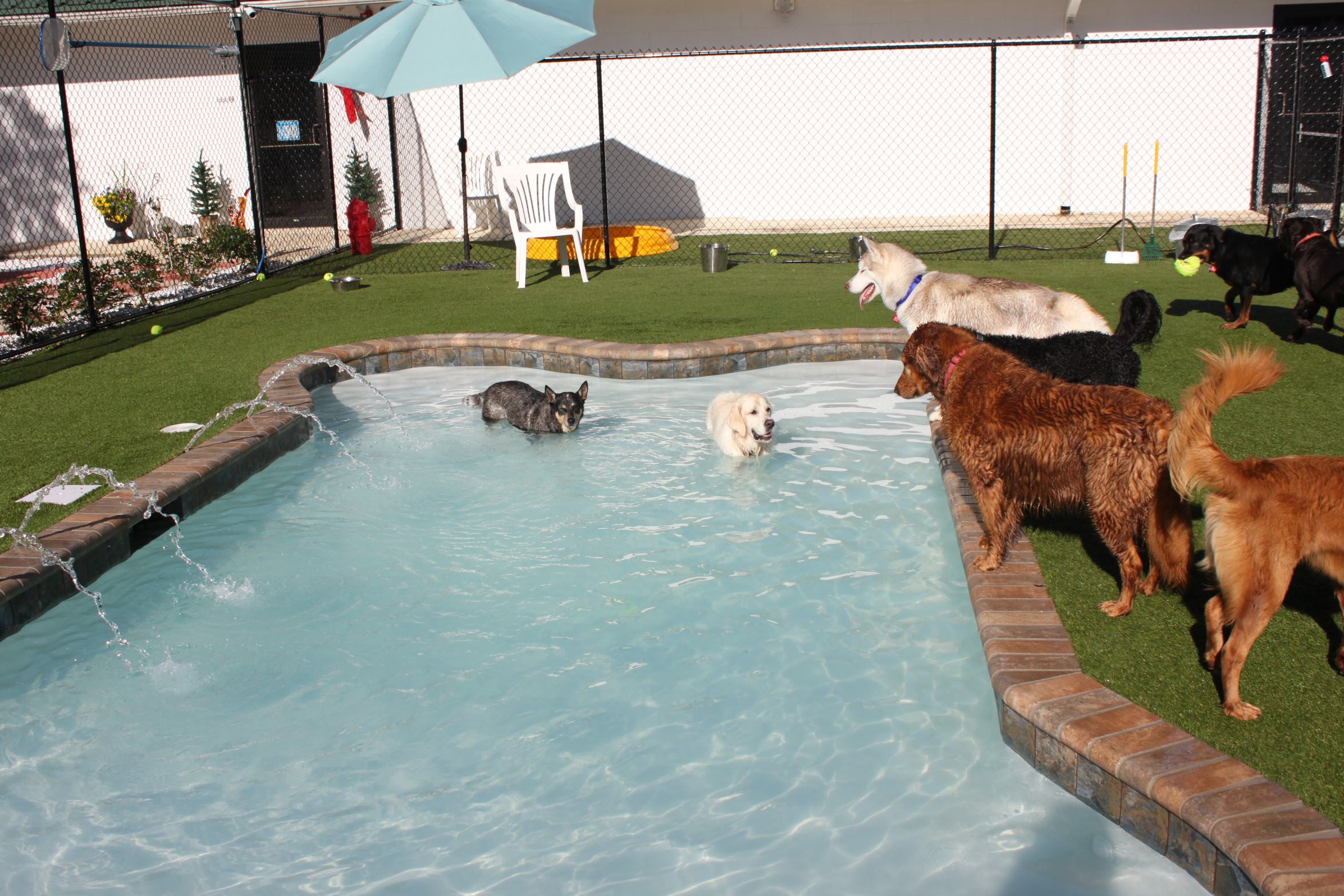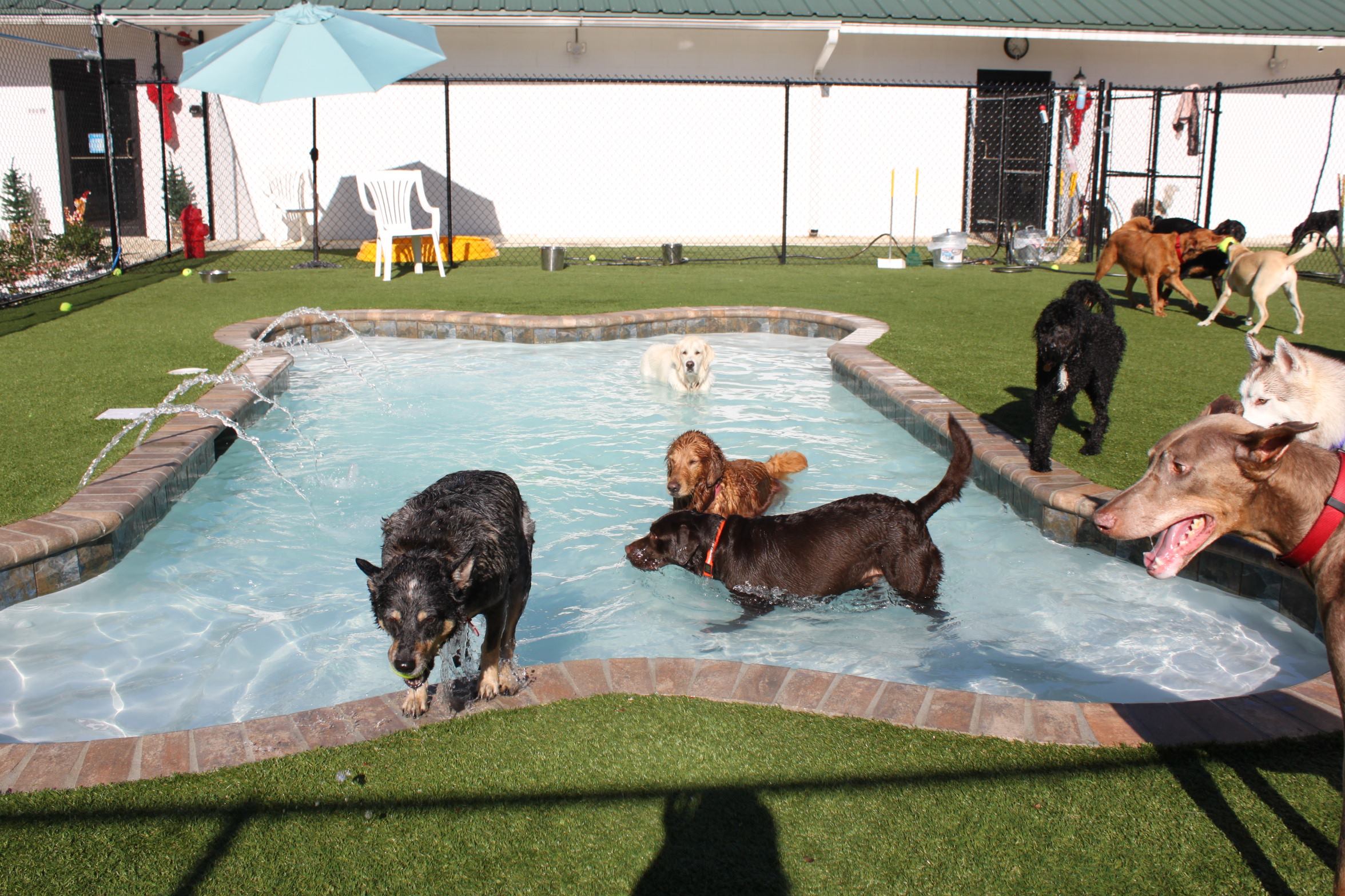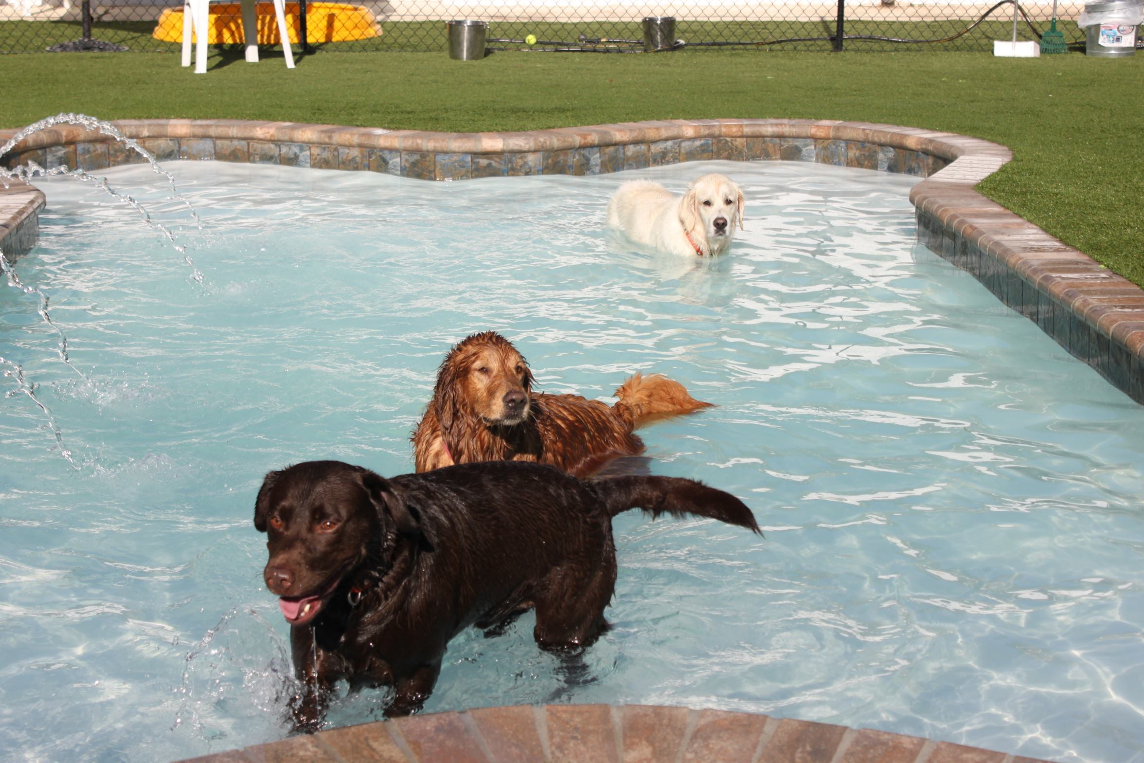 Soggy dogs don’t mean a messy pool. It’s easy to keep clean. Hair can be brushed into an unblockable 32-inch main drain. It’s salt chlorinated and operates on a sand filter for easy maintenance.