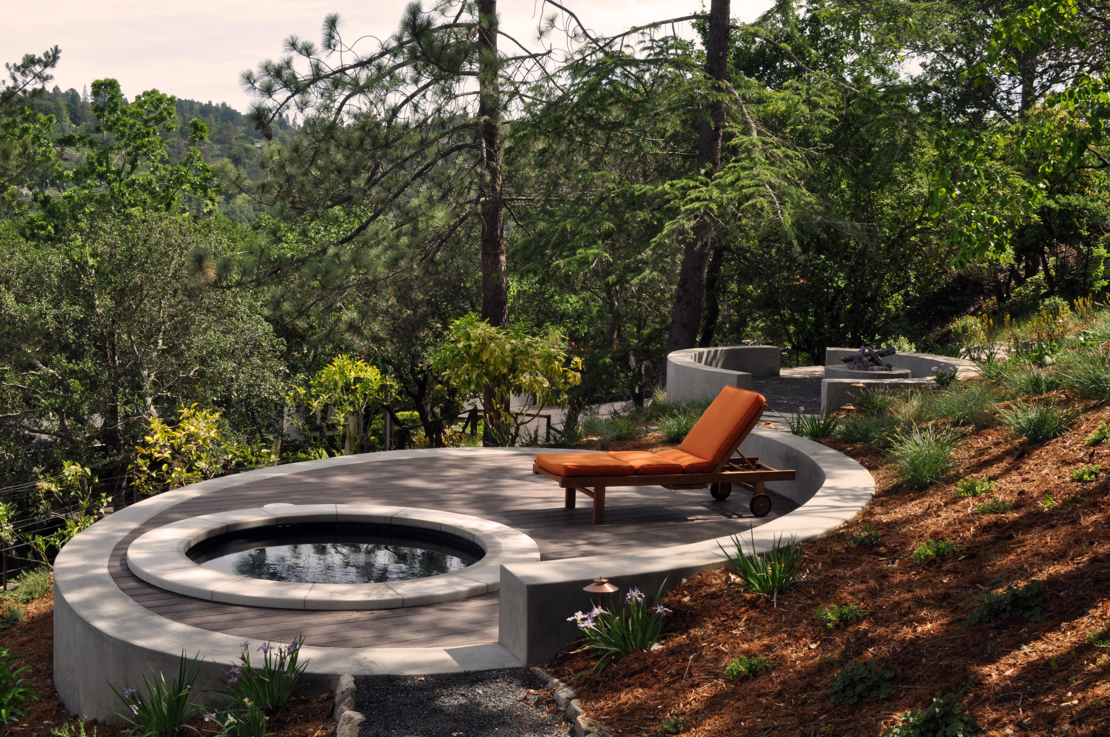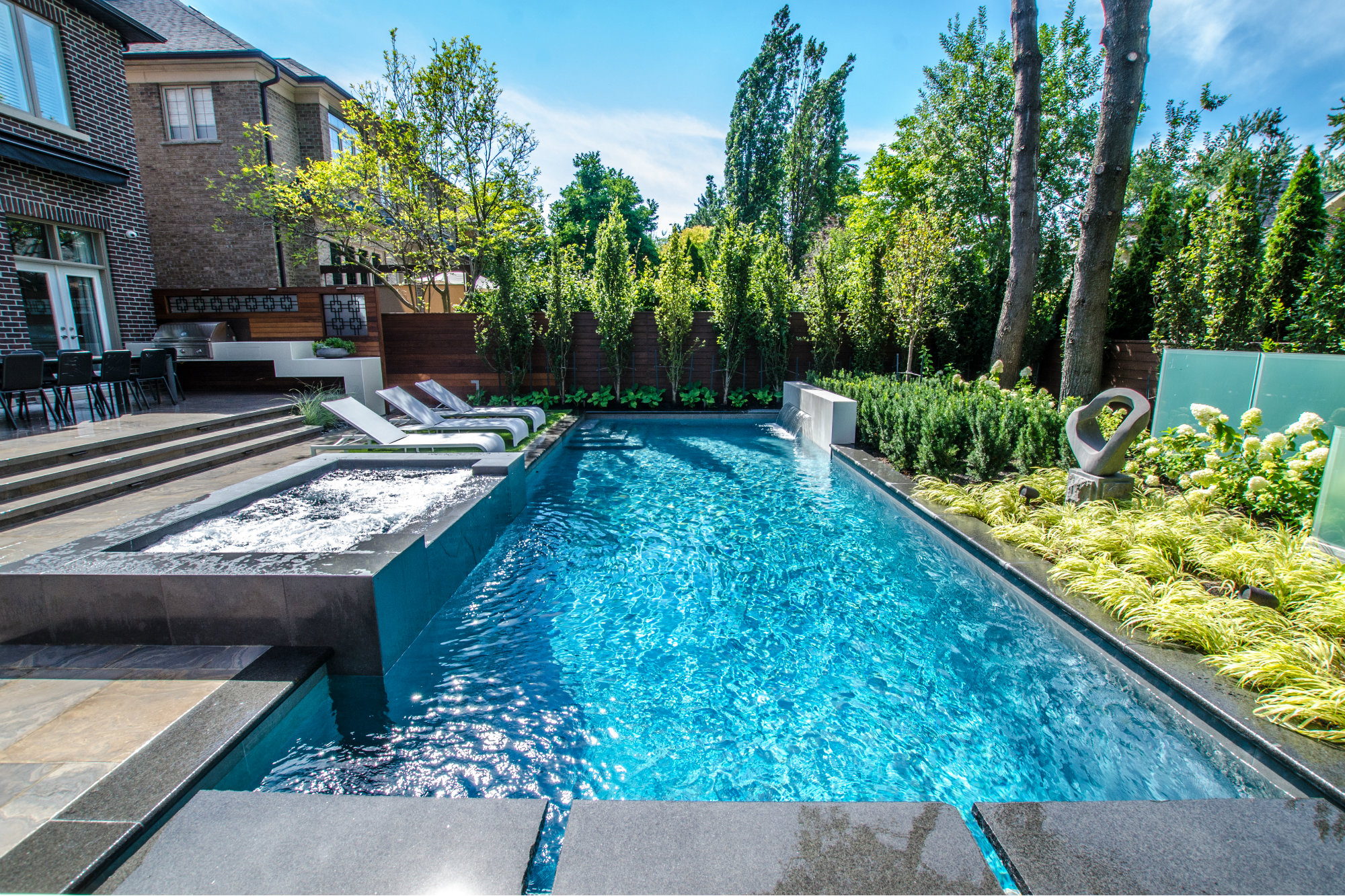 Simple forms and monolithic color/texture blocks make for an elegant presentation of this small backyard poolscape