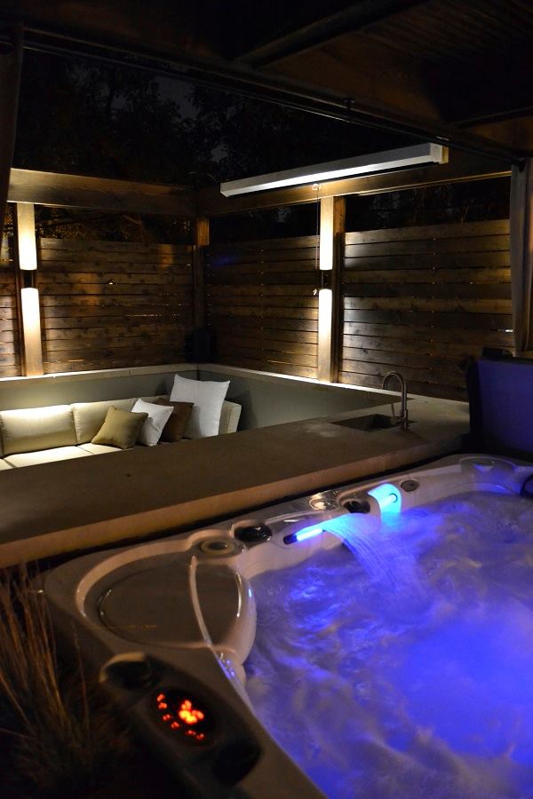 All in the details: From the Ipe decking and cedar pergola to the built-in planters with seasonal grasses that flank the spa steps, this project sports sophisticated touches. “We created something very contemporary and clean, an area with a more chic vibe,” Miller says. To get there, his team first demolished the existing garage and built a two-car garage from scratch, then created the outdoor room on top. Sleek, stylish details include subtle wall lighting, specially designed by Miller, which transforms the space at night. The sound system can be controlled from the homeowner’s smartphone. There’s a nicely equipped kitchen, comfortable seating areas and a fire pit. A bar was built up to the edge of the spa so that, even if you’re in the water, you’re not removed from things. The client, a 30-something sales professional who travels often, wanted a space where she could invite friends over on a Saturday. Mission accomplished.