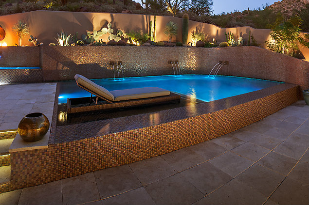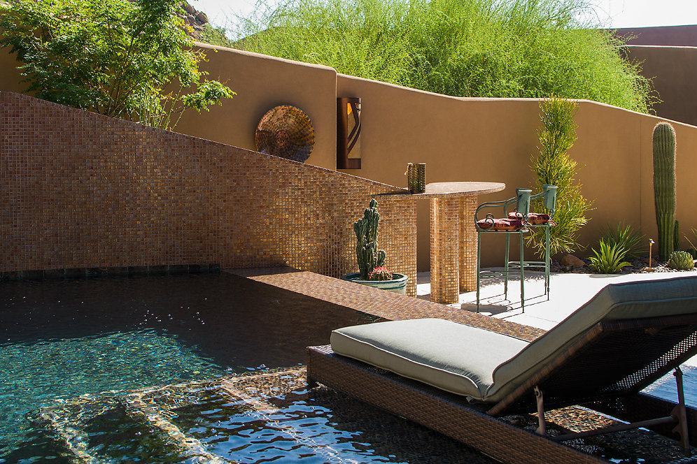 Figurative range: To open up the view of Pinnacle Peak, the design team lowered the existing property wall by approximately 16 inches. They gave it a curving top edge to evoke a mountain range. They did the same with the wall around the waterscape, veneering it in the deep copper glass tile, to add dimension to the impressionist mountains. Native specimens in the planter introduce realism to the desert tableau. Pre-existing mesquite and foothill palo verde trees just outside the property are thinned out occasionally so the homeowners can view Pinnacle Peak through the canopies. A sunshelf, surrounded by a vanishing edge so it appears to float, is outfitted with a permanent chaise.