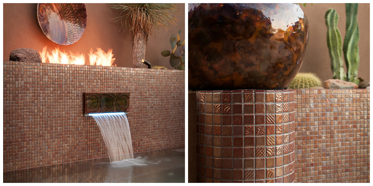 Desert rose: Three varieties of copper glass tiles are used throughout the installation to provide different textures and feels. The colors transform throughout the day from a rosy copper to more golden tones later in the day, as the sun directly faces it. Homeowner Mary Narvell personally chose copper accents for the sheet waterfall, walls and scuppers.